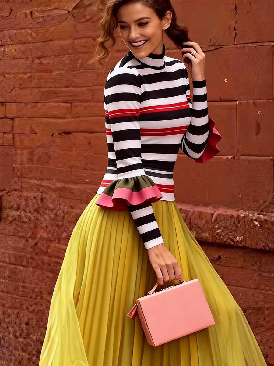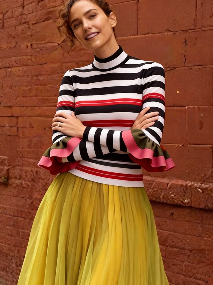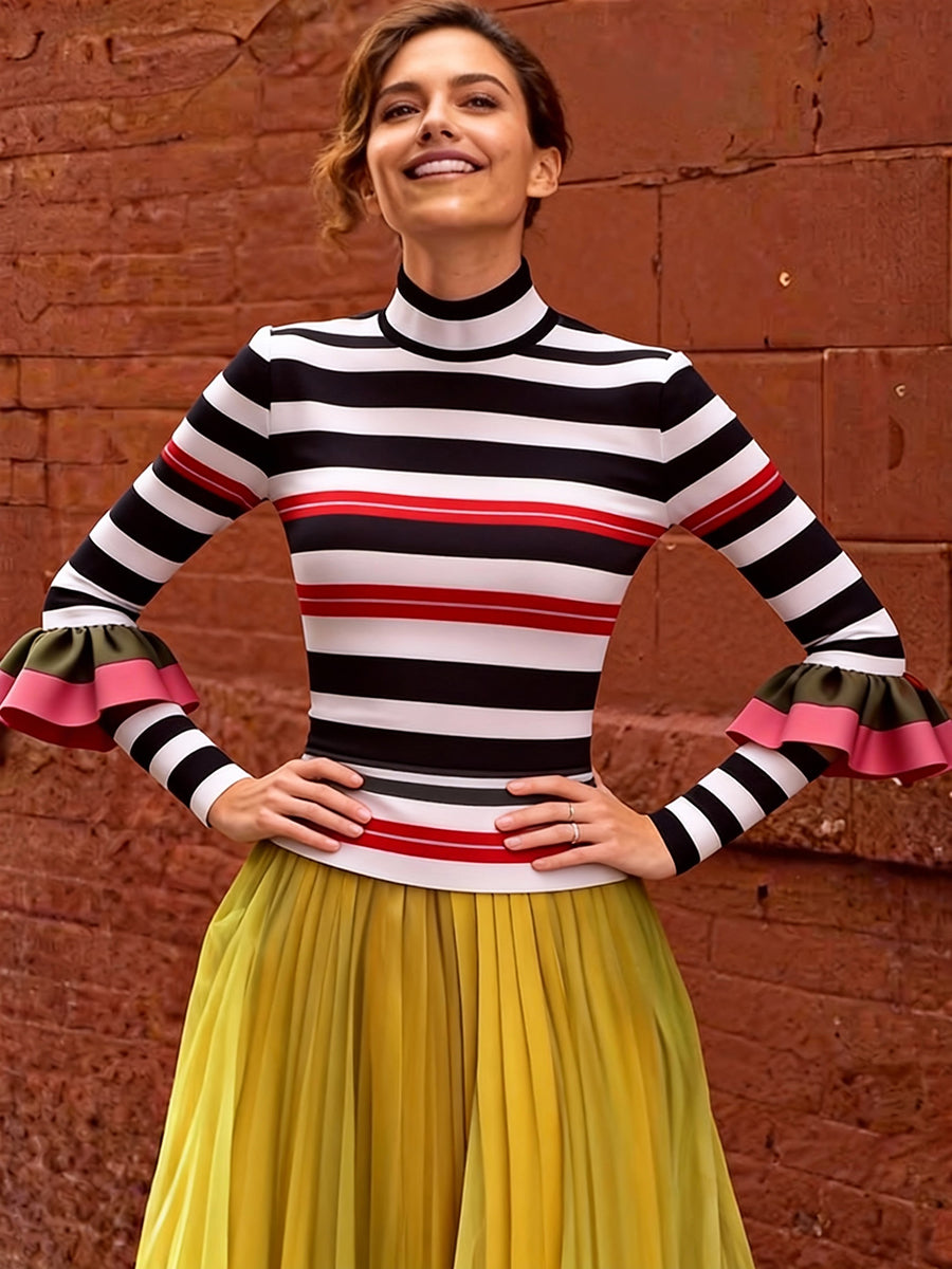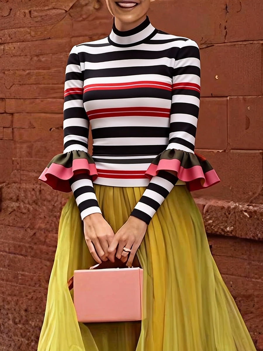 Long Sleeves Skinny Contrast Color Ruffled Split-Joint Striped Half Turtleneck Blouses&Shirts Tops