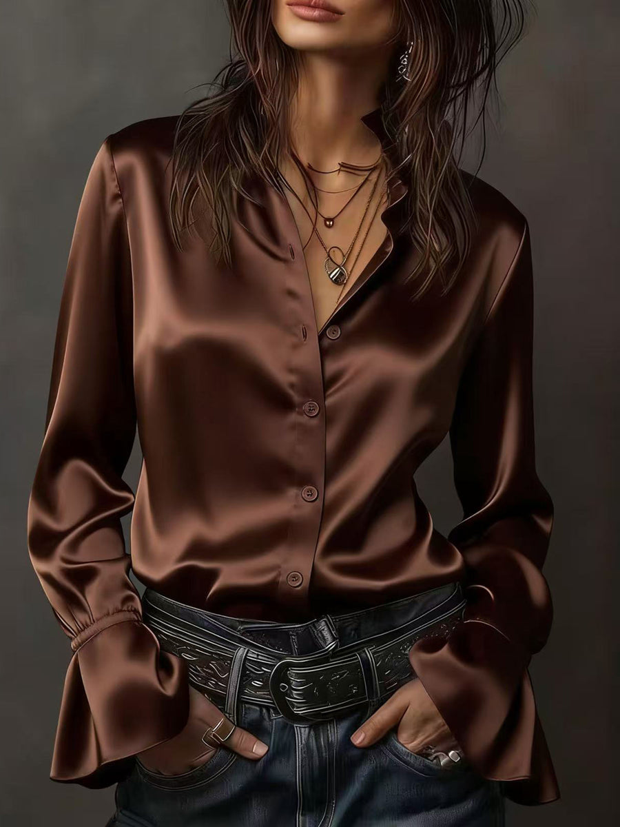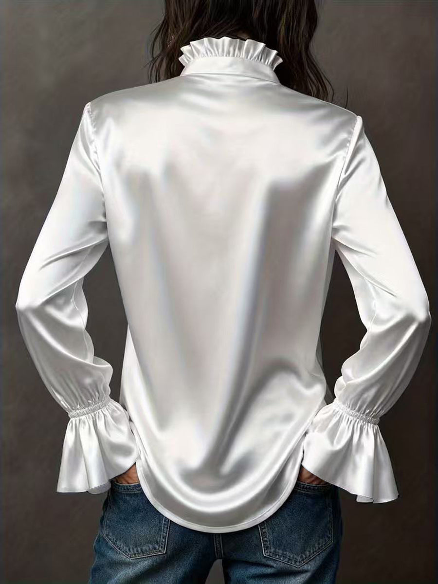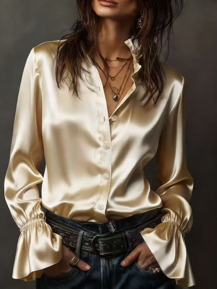 Flared Sleeves Long Sleeves Buttoned Elasticity Solid Color Lapel Blouses&Shirts Tops