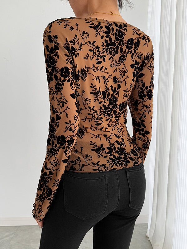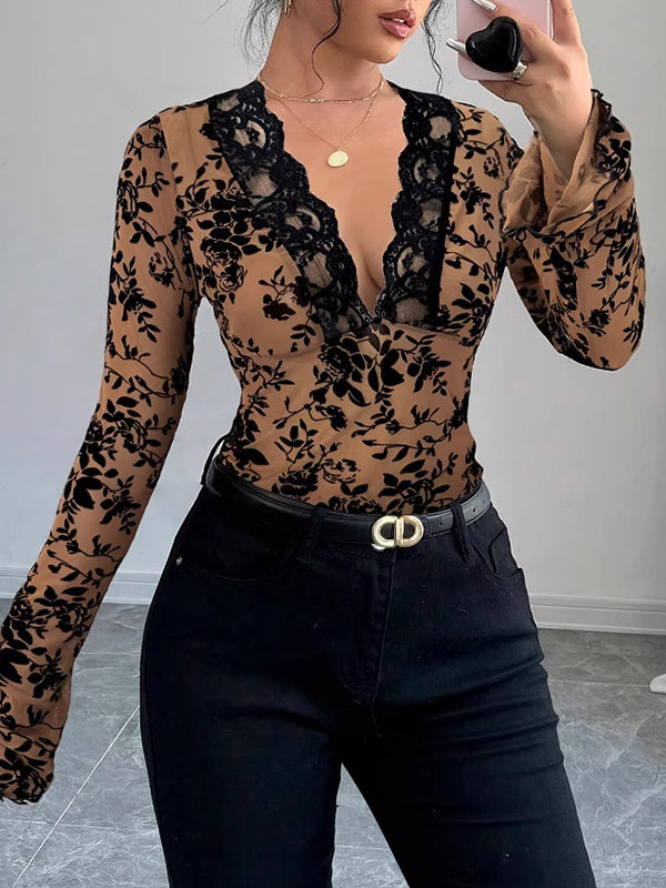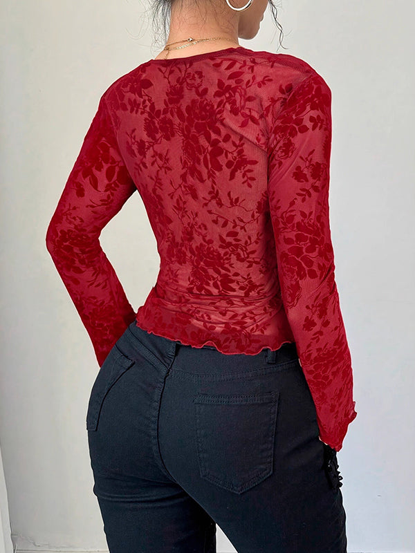Flared Sleeves Long Sleeves Solid Color Deep V-Neck T-Shirts