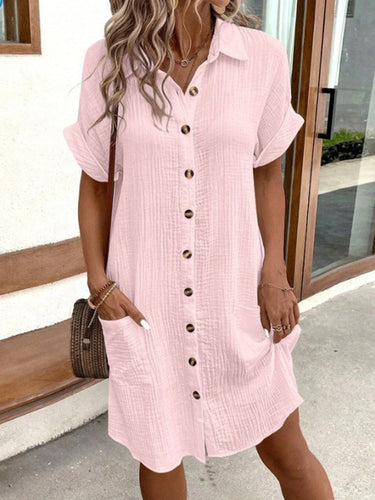 Half Sleeves Loose Buttoned Pockets Solid Color Lapel Mini Dresses