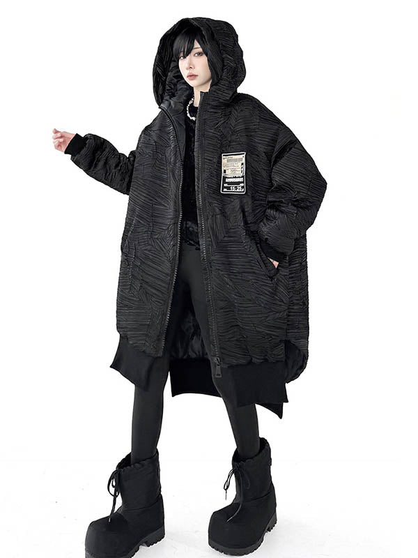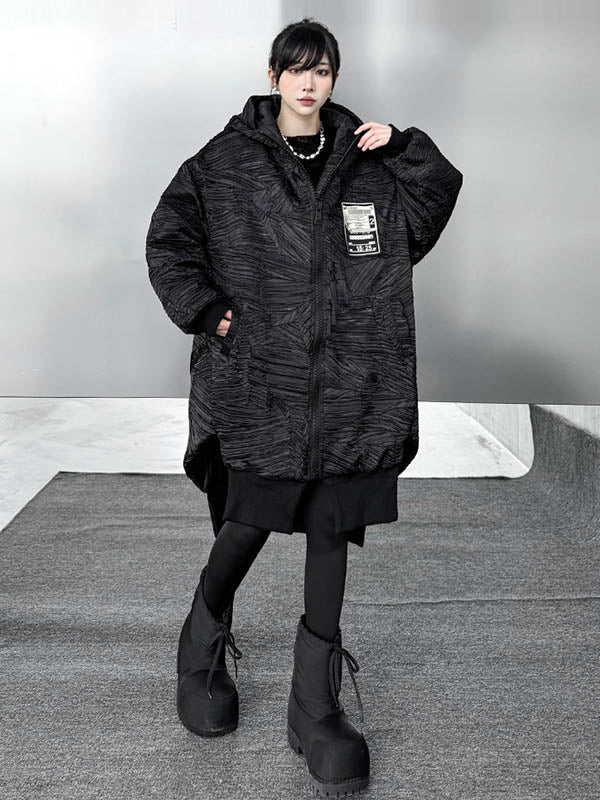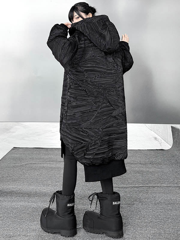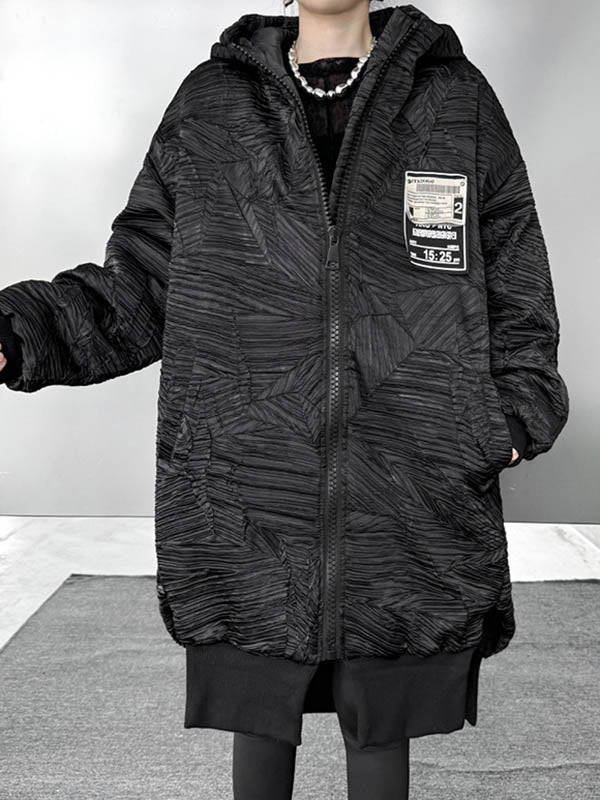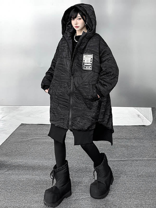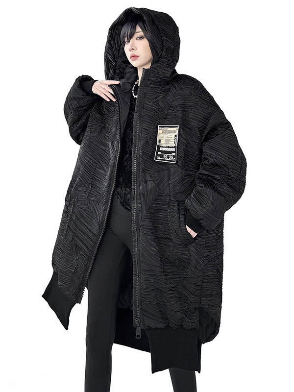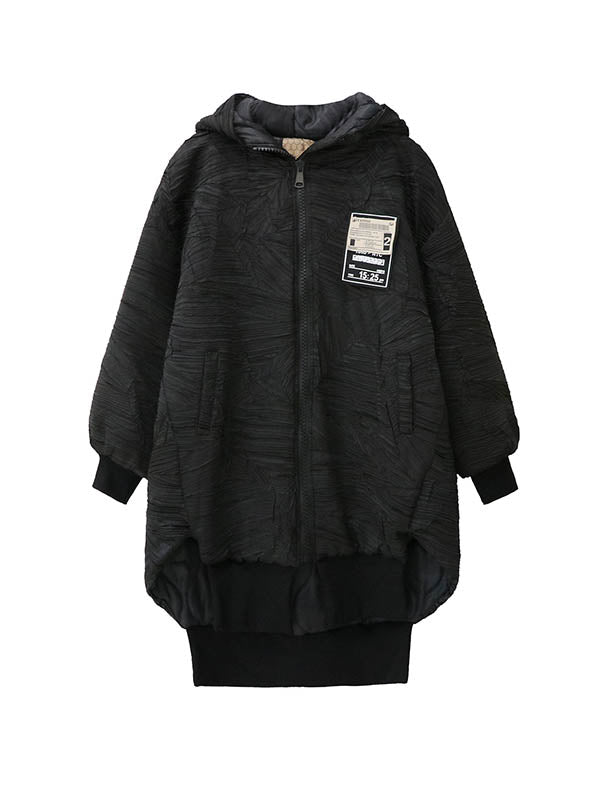 High-Low Irregularity Abstract Printed Contrast Color Split-Joint Zipper Hooded Outerwear Overcoat