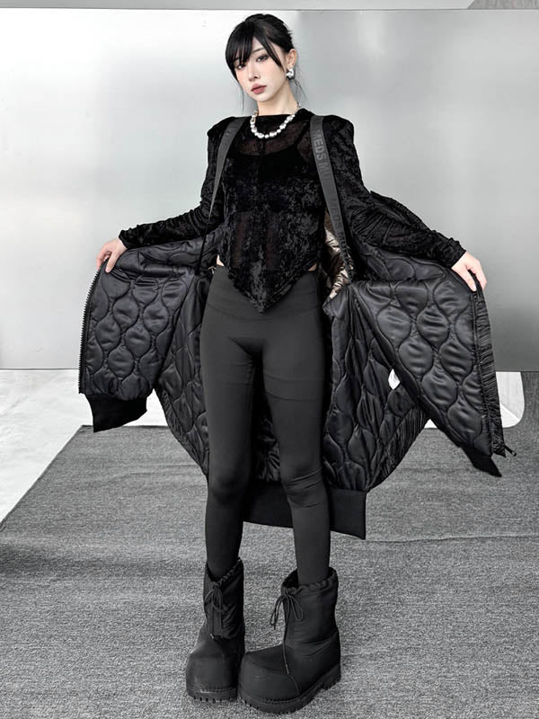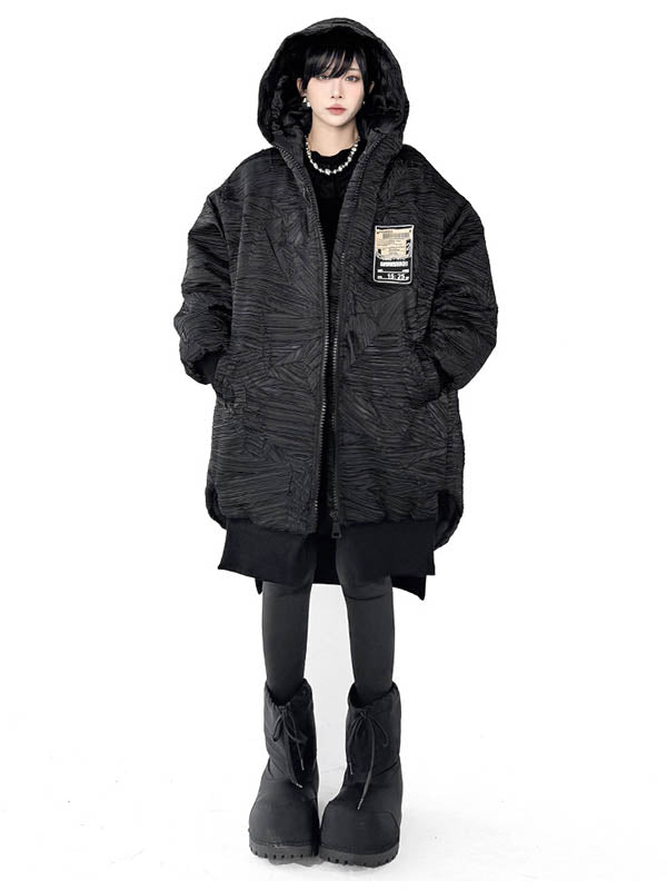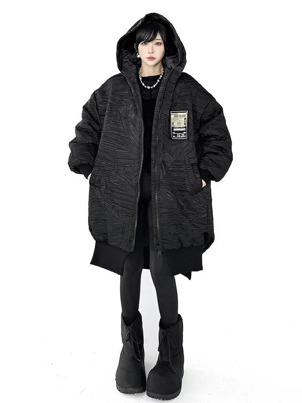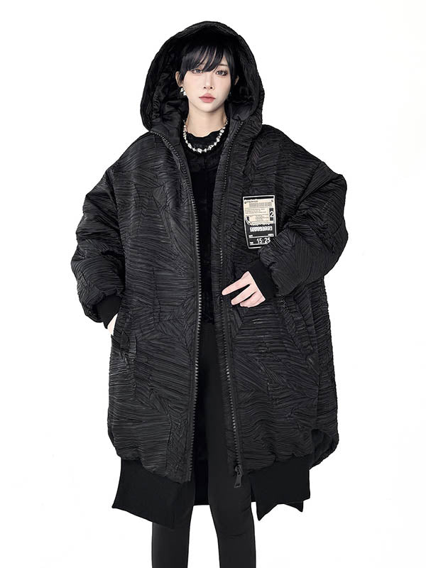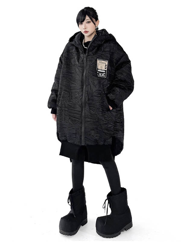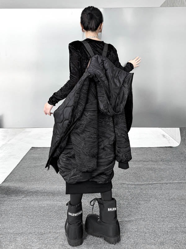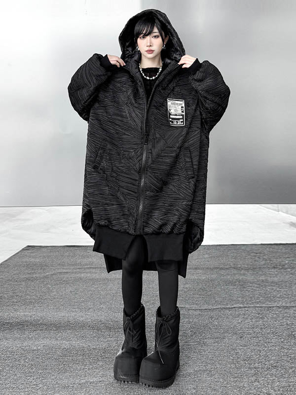 High-Low Irregularity Abstract Printed Contrast Color Split-Joint Zipper Hooded Outerwear Overcoat