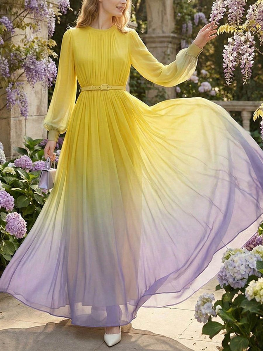 High Waisted Long Sleeves Belted Contrast Color Gradient Pleated Split-Joint Round-Neck Maxi Dresses