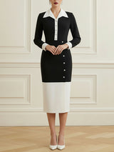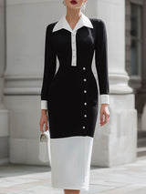 High Waisted Long Sleeves Buttoned Contrast Color Split-Front Split-Joint Lapel Midi Dresses