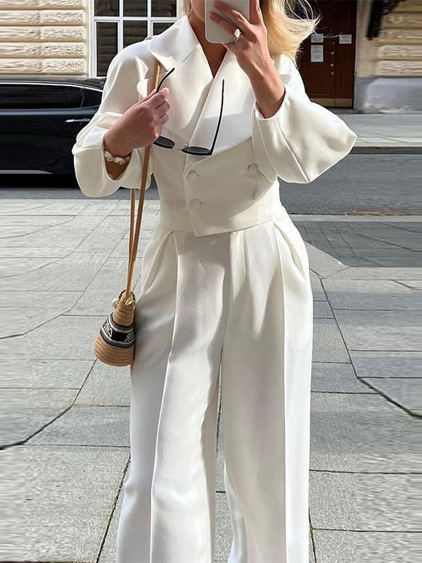High Waisted Long Sleeves Buttoned Pleated Solid Color Lapel Outwear + Pants Two Pieces Set