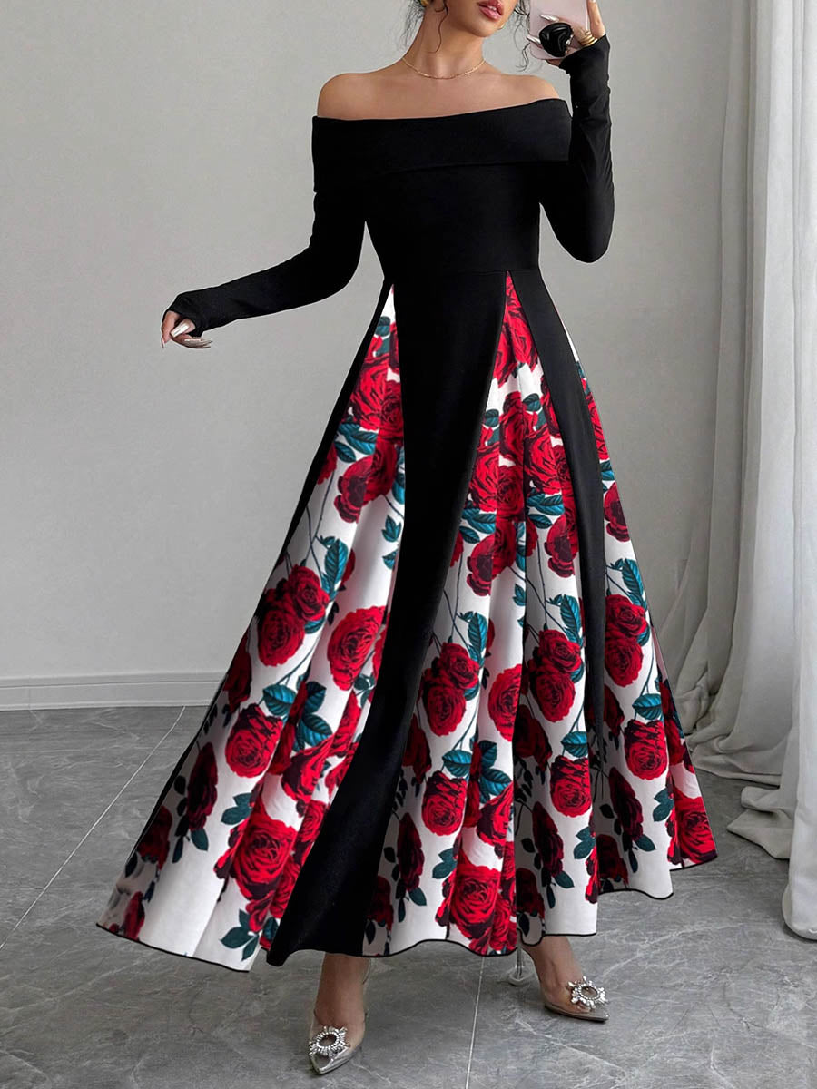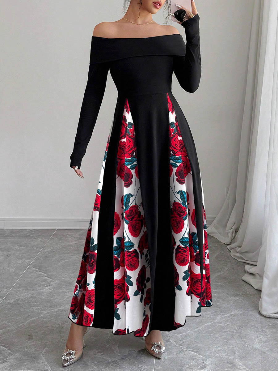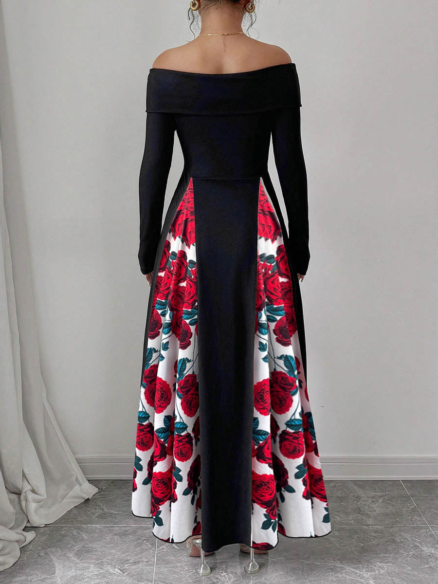 High Waisted Long Sleeves Contrast Color Flower Print Split-Joint Off-the-shoulder Maxi Dresses
