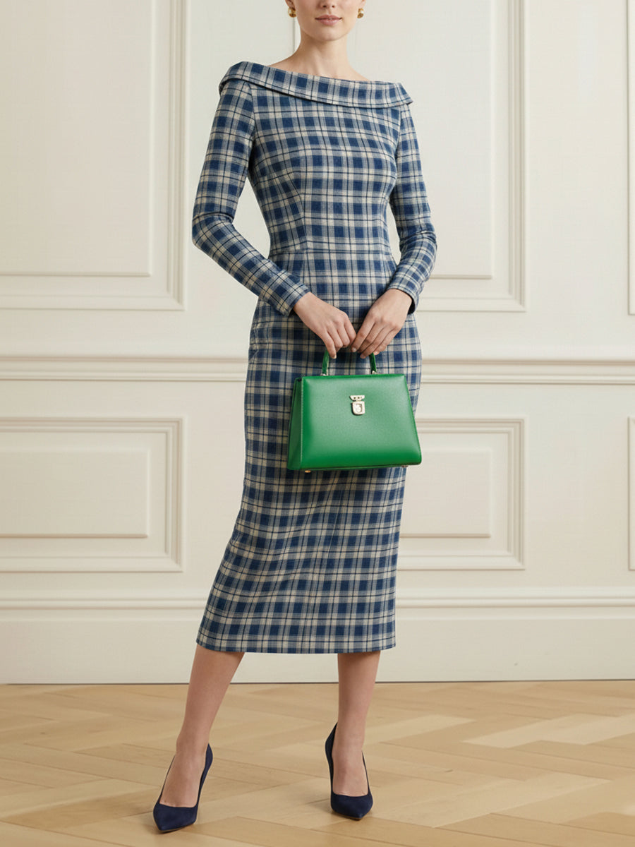 High Waisted Long Sleeves Plaid Split-Joint Round-Neck Midi Dresses