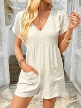 High Waisted Loose Backless Pockets Solid Color V-Neck Rompers