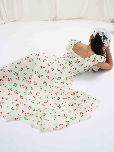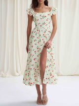 High Waisted Loose Buttoned Elasticity Flower Print Pleated Square-Neck Midi Dresses