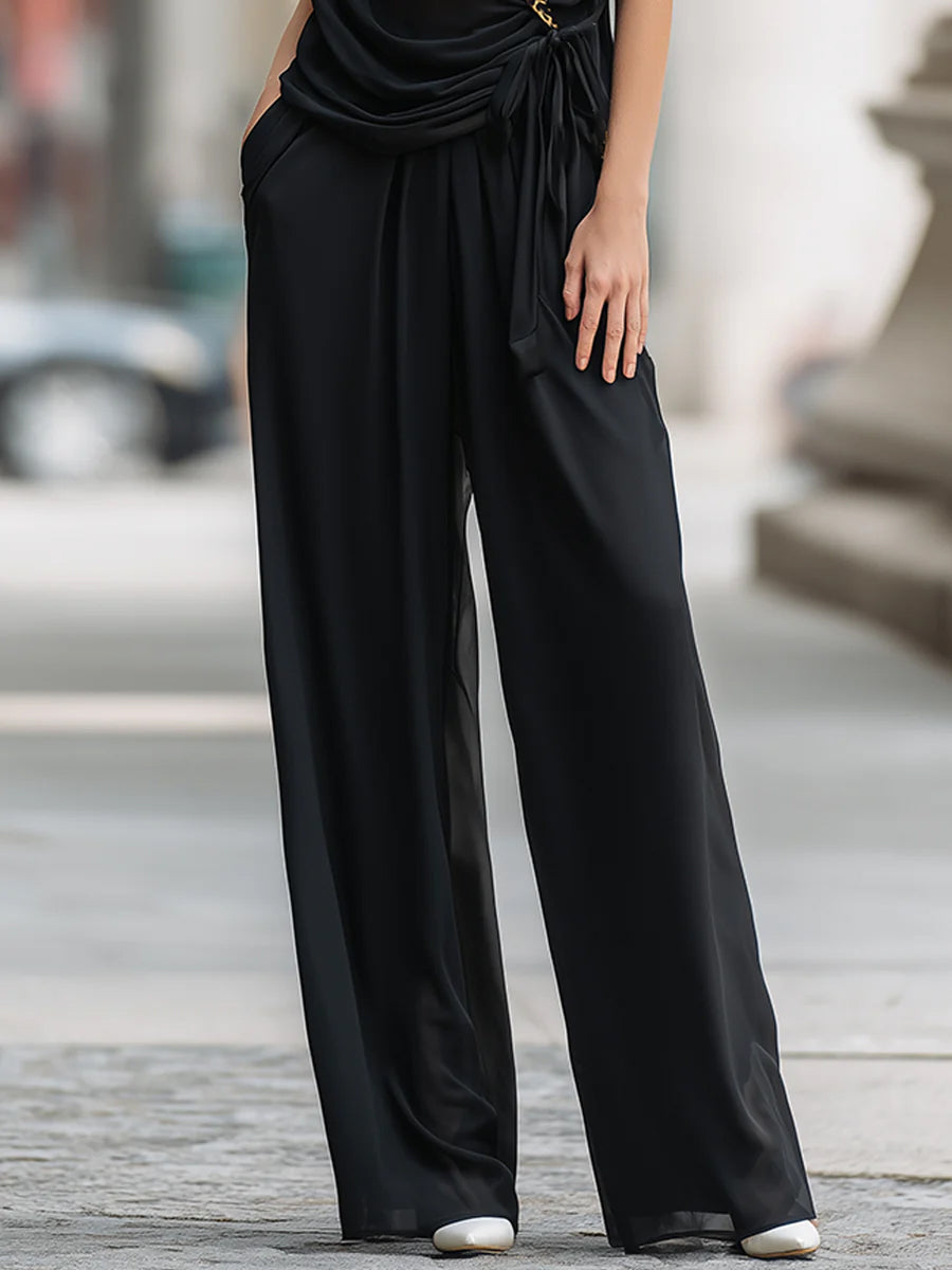 High Waisted Wide Leg Pockets Solid Color Pants Trousers