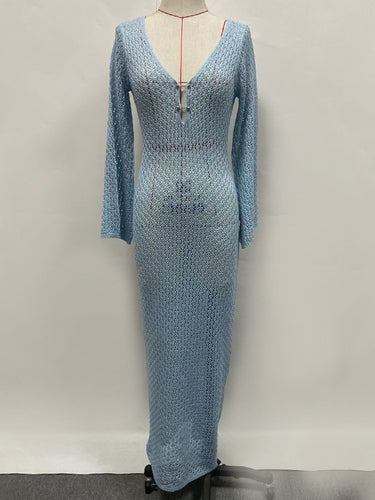 Hollow See-Through Smocked Solid Color Sun Protection Deep V-Neck Beach Cover-Up Maxi Dresses