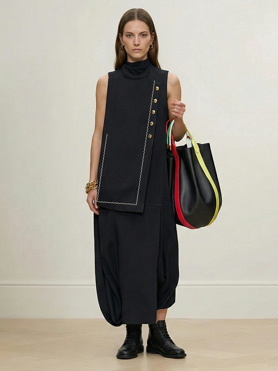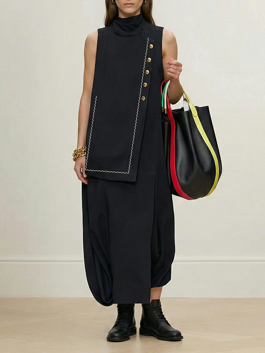 Irregularity Loose Asymmetric Buttoned Contrast Color Layered Line Split-Joint Split-Side Half Turtleneck Maxi Dresses