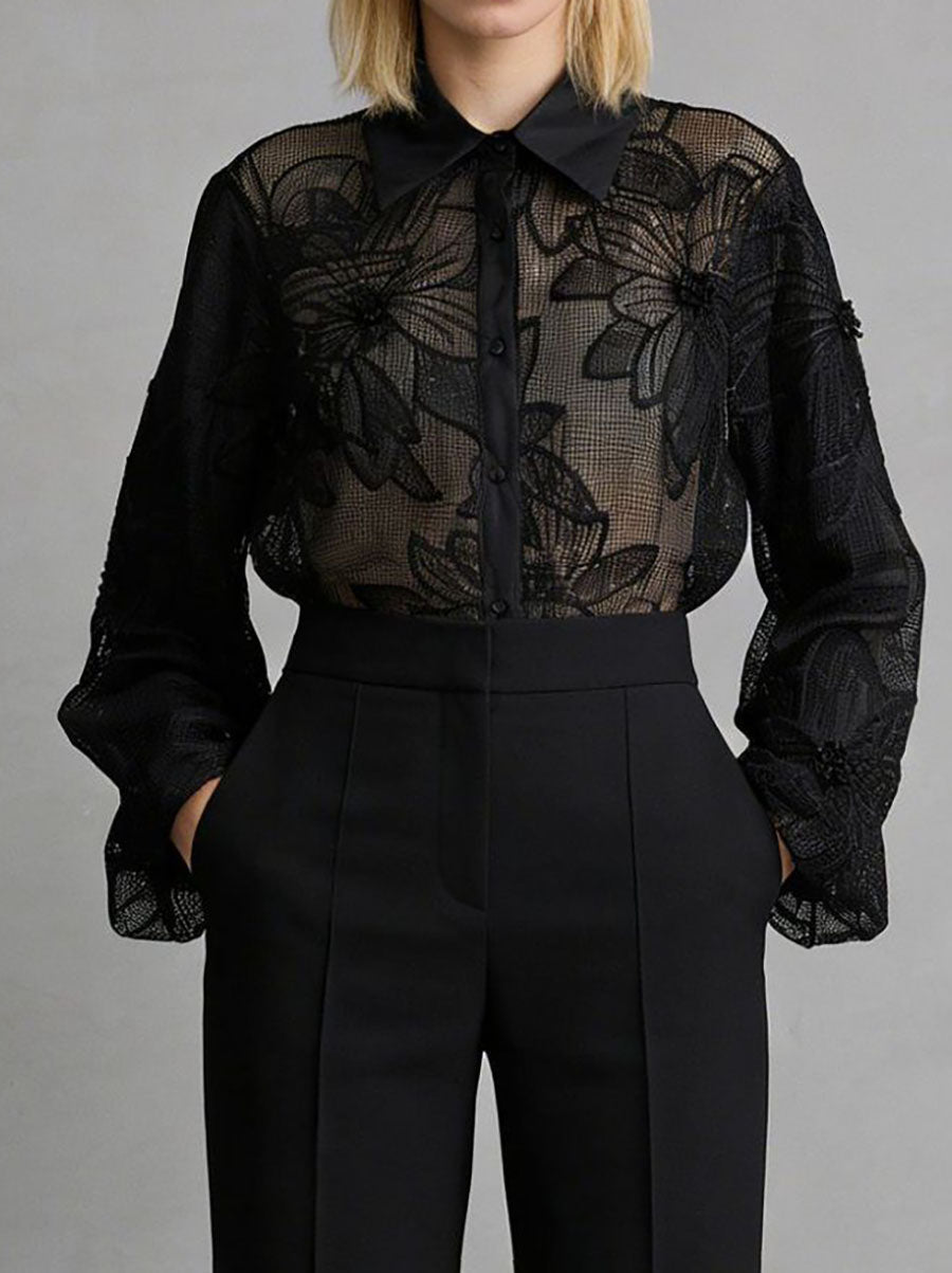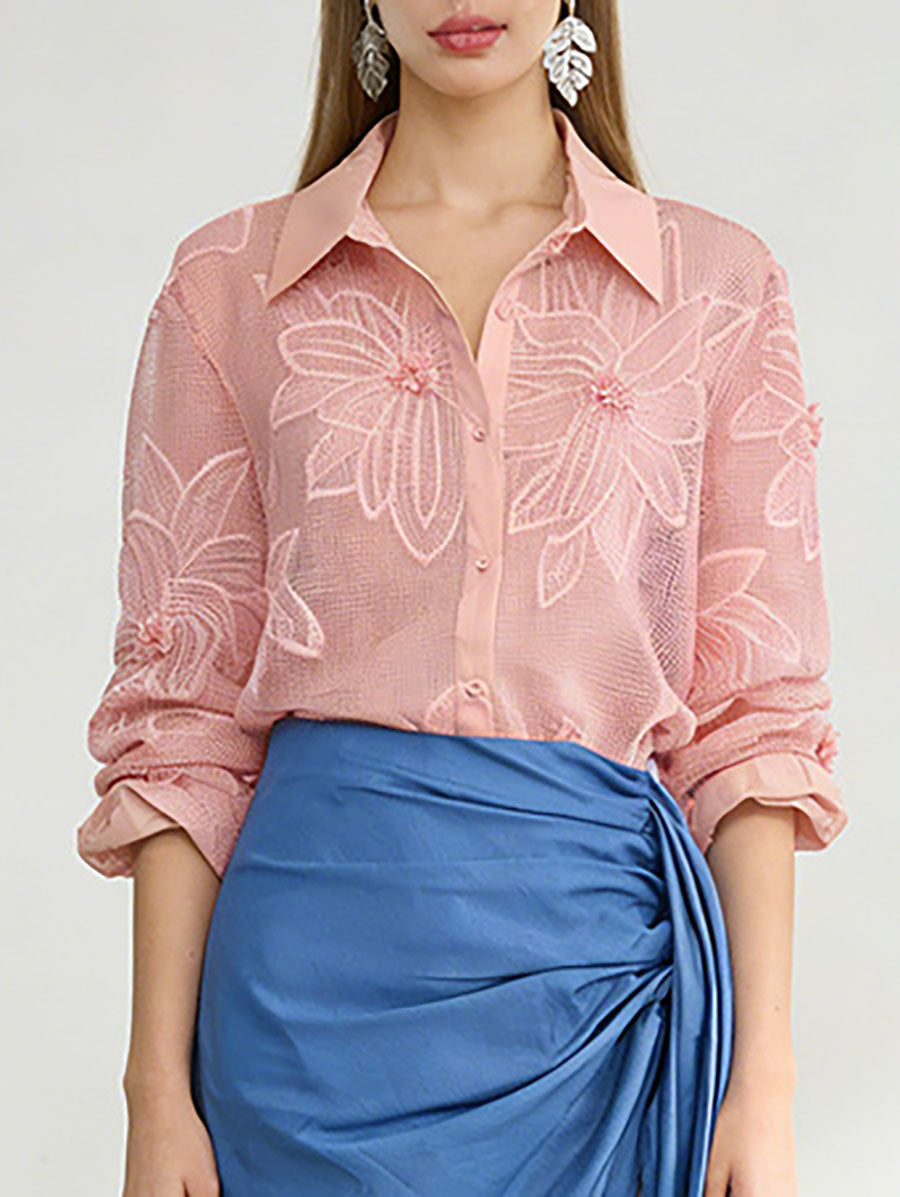 Long Sleeves Buttoned Embroidered Solid Color Lapel Blouses&Shirts Tops