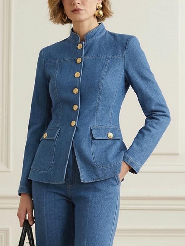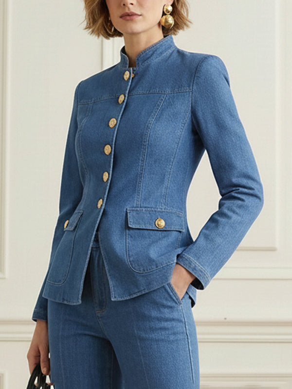 Long Sleeves Buttoned Pockets Solid Color Stand Collar Outerwear