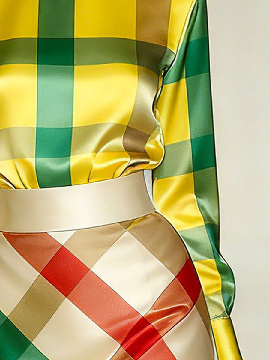 Long Sleeves Contrast Color Plaid Round-Neck T-Shirts Tops