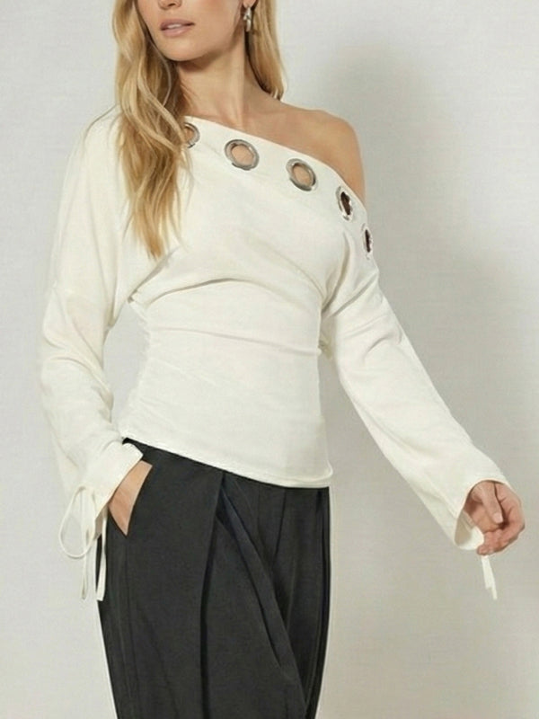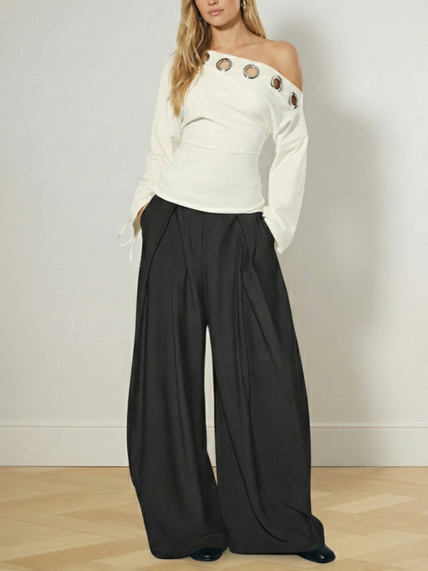 Long Sleeves Drawstring Hollow Pleated Solid Color Tied One-Shoulder T-Shirts