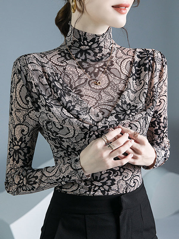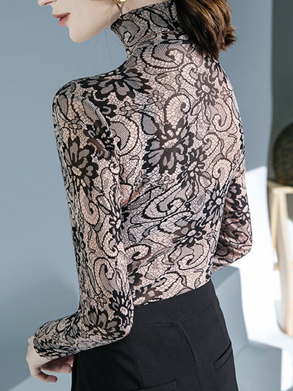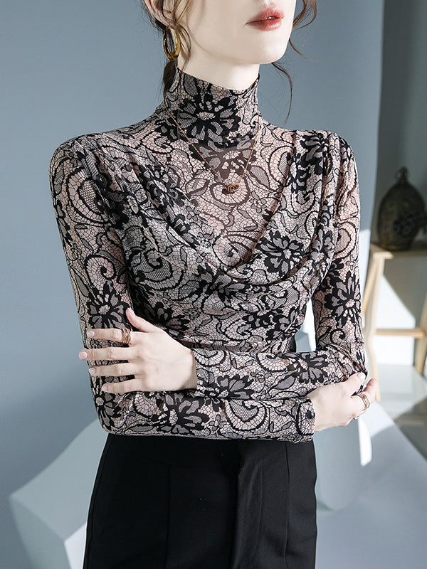 Long Sleeves Flower Print Pleated Mock Neck T-Shirts Tops