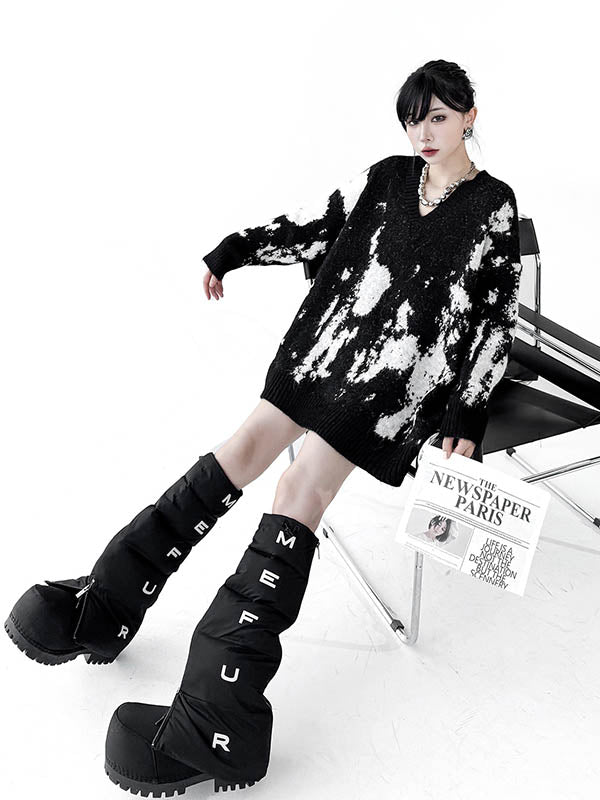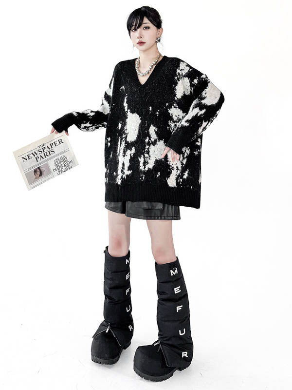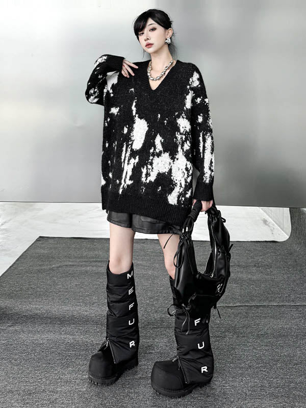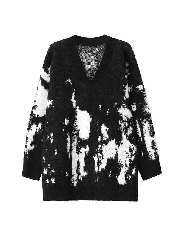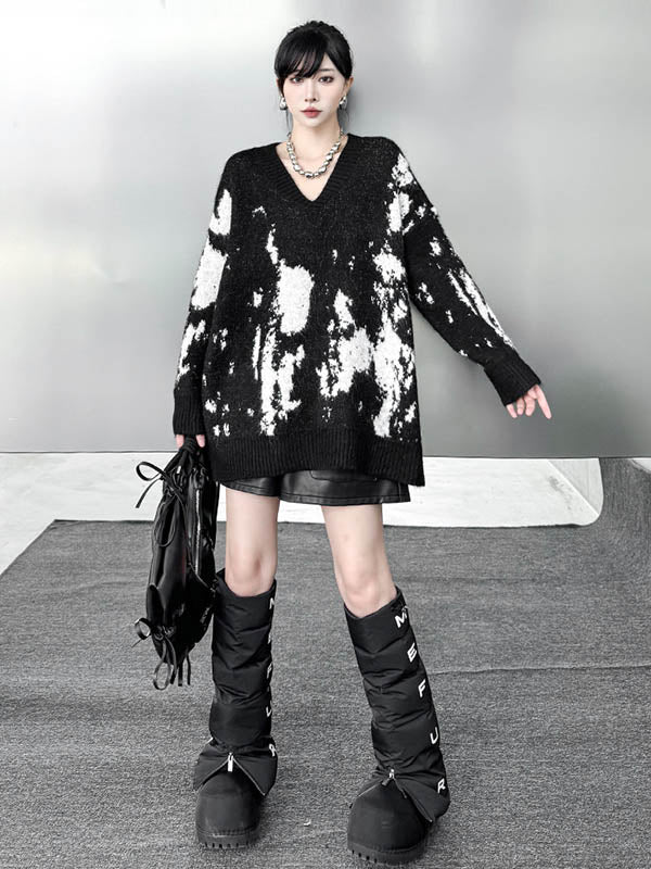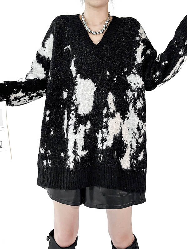 Long Sleeves Loose Abstract Printed Contrast Color Ribs Split-Joint V-Neck Sweater Tops