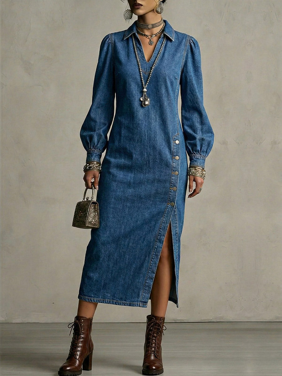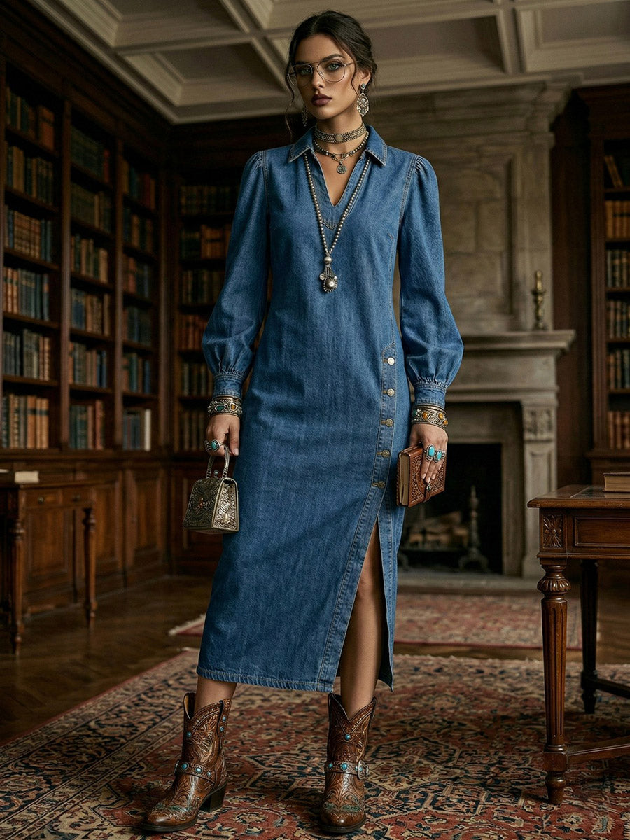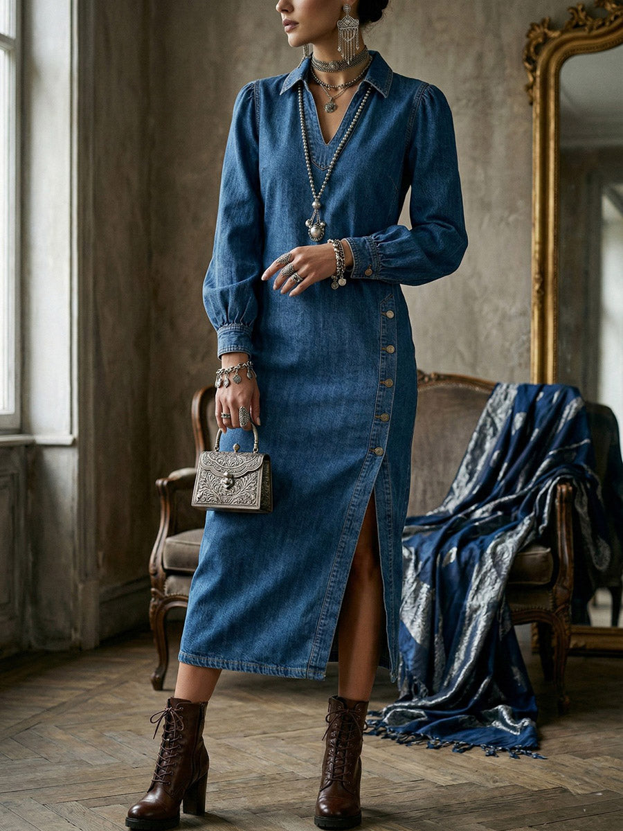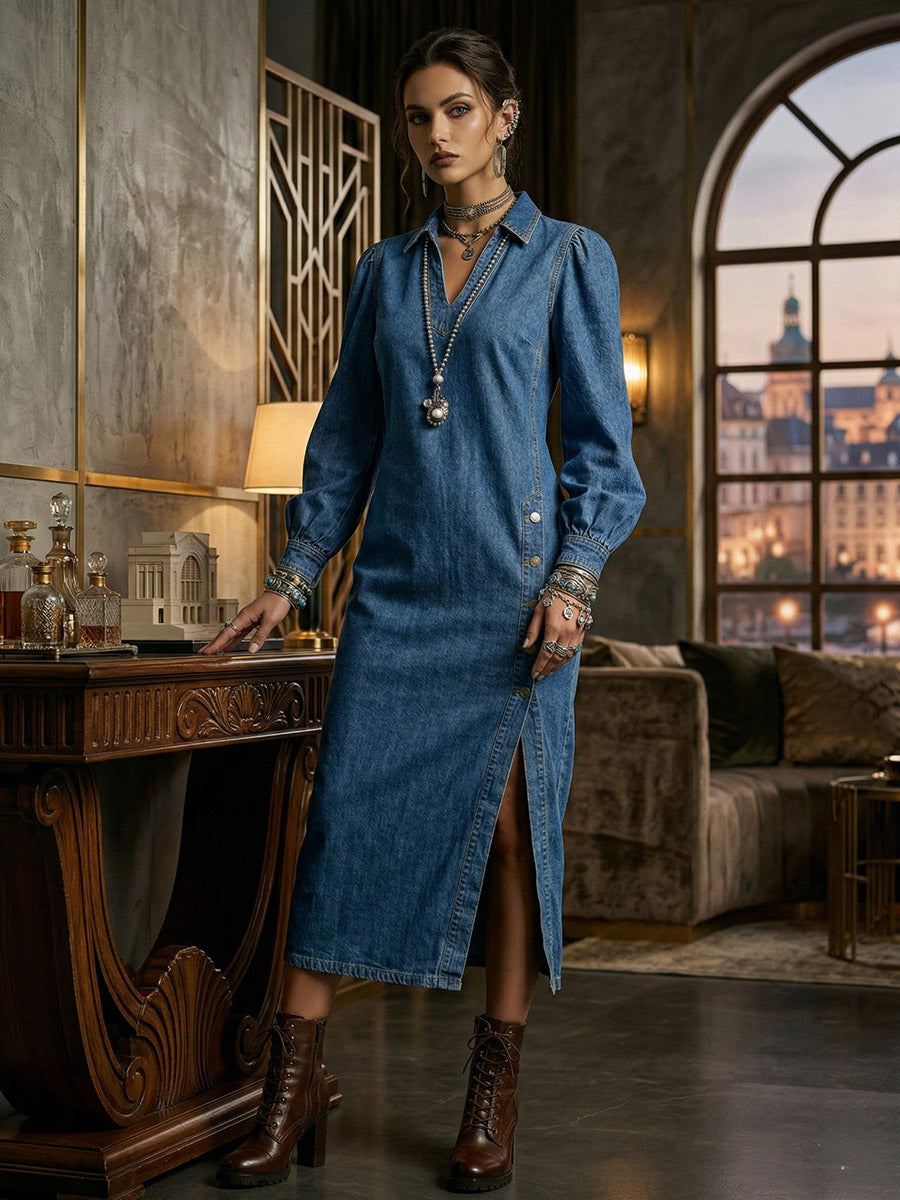 Long Sleeves Loose Asymmetric Buttoned Solid Color Split-Joint Split-Side Lapel Midi Dresses