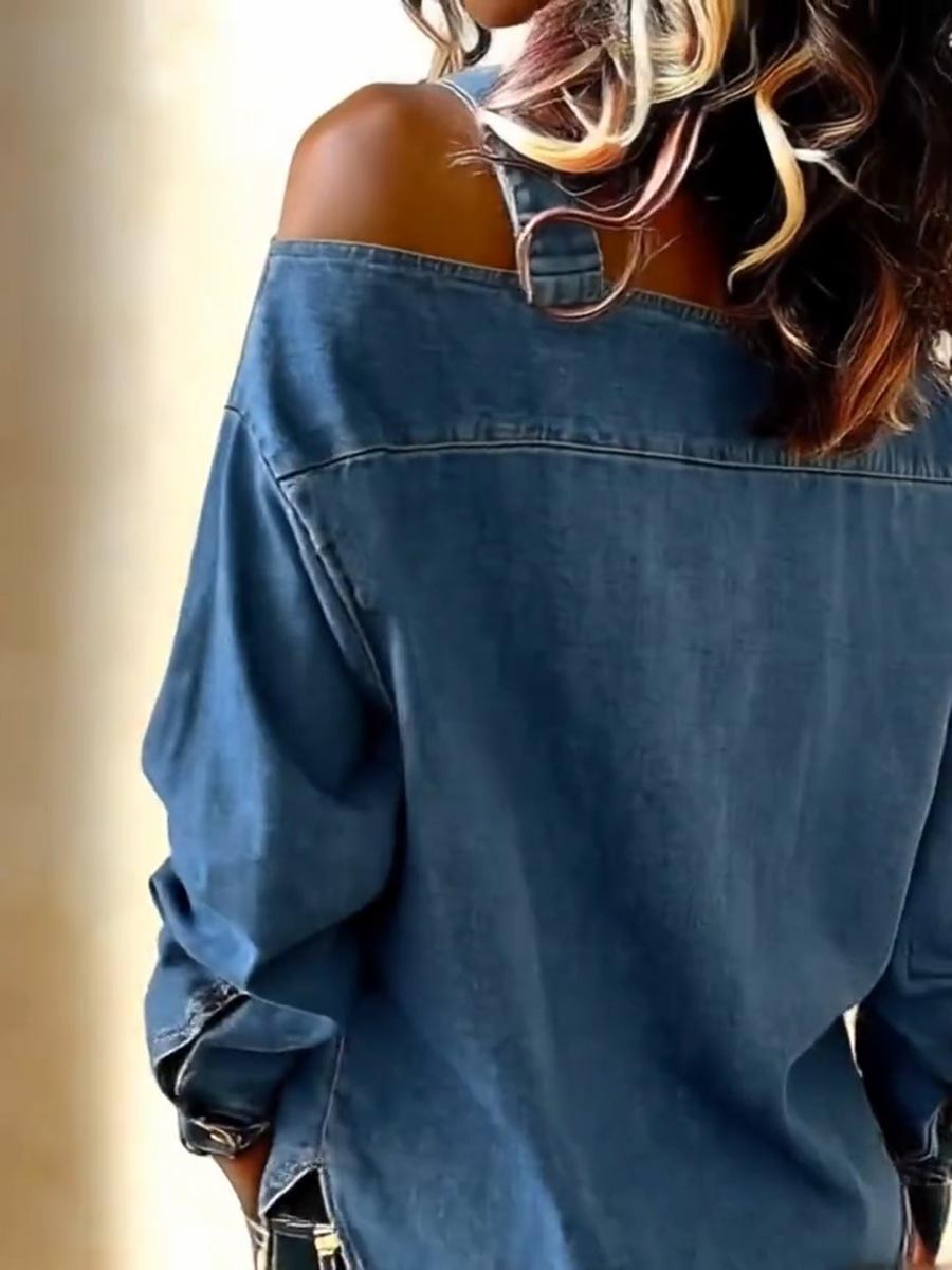 Long Sleeves Loose Buckle Split-Joint Cold Shoulder Blouses&Shirts Tops