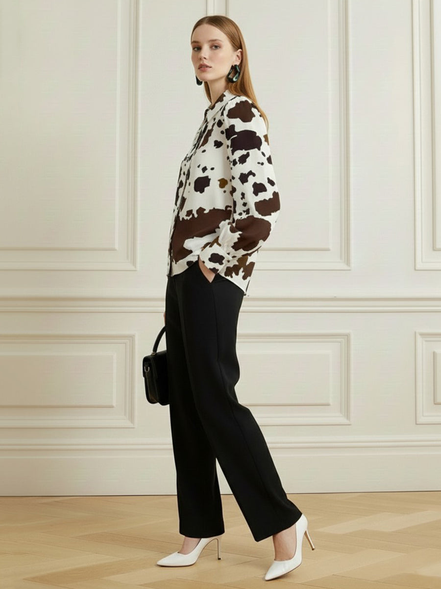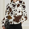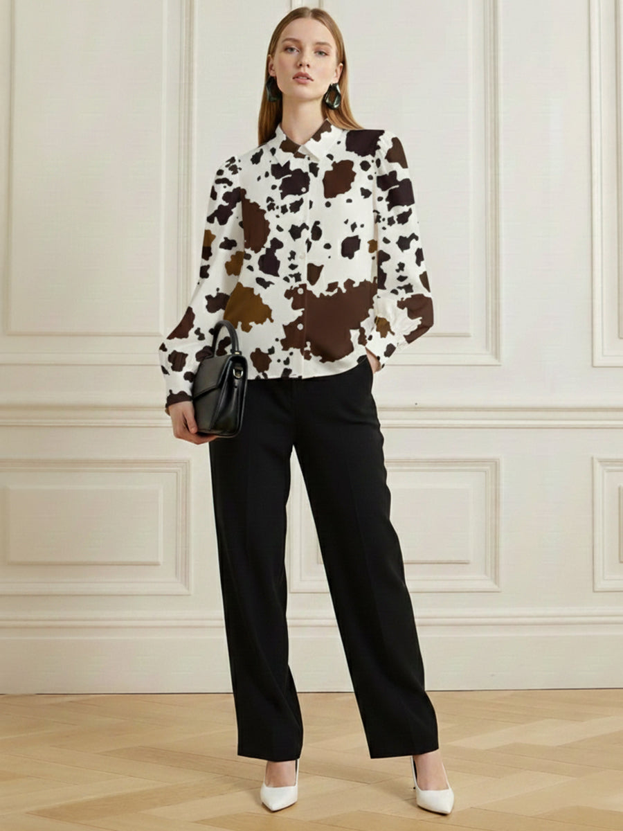 Long Sleeves Loose Buttoned Contrast Color Cow Printed Split-Joint Lapel Blouses&Shirts Tops