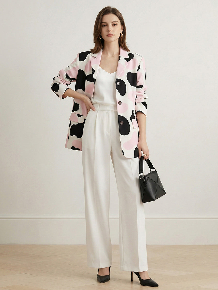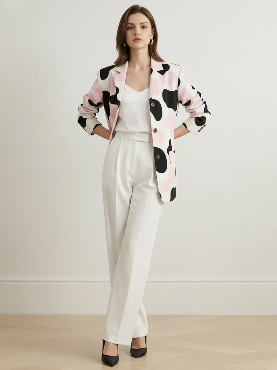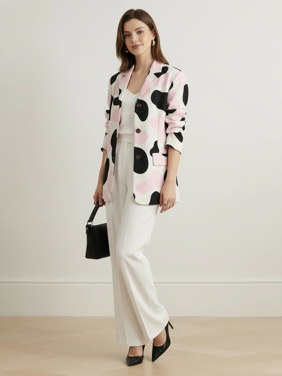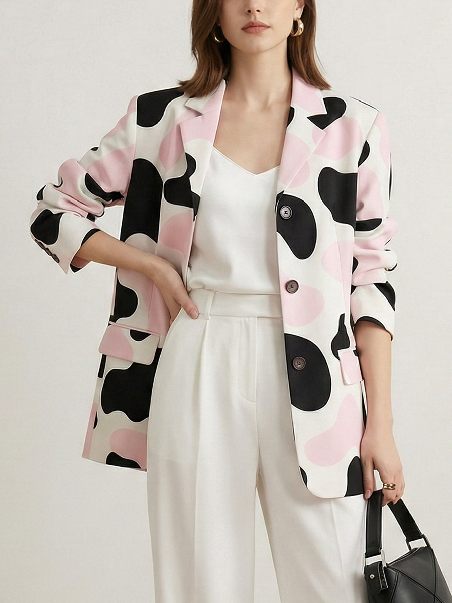 Long Sleeves Loose Buttoned Contrast Color Cow Printed Split-Joint Notched Collar Blazer Outerwear