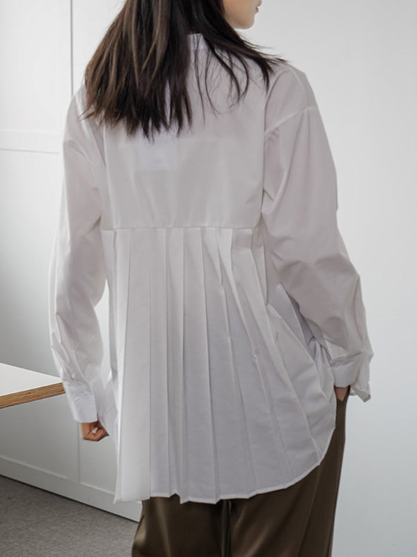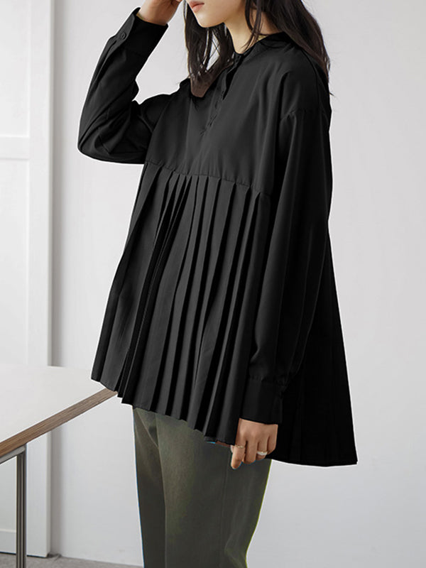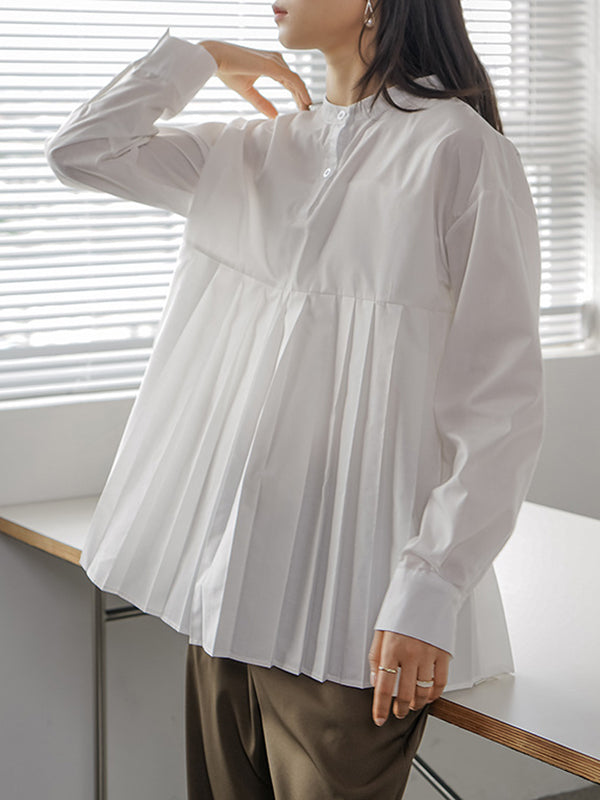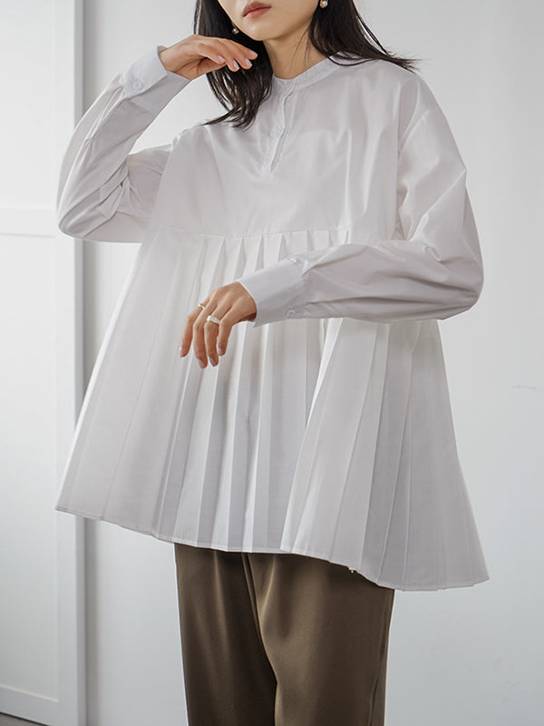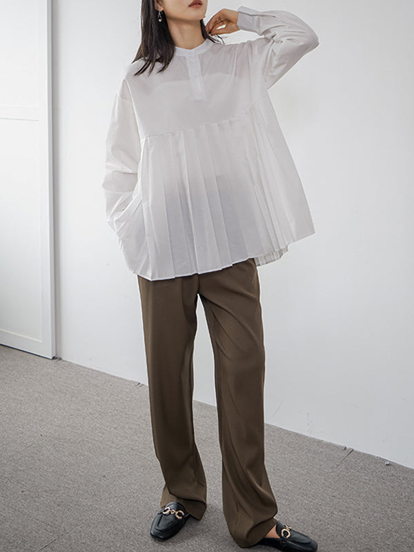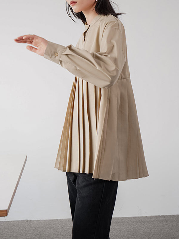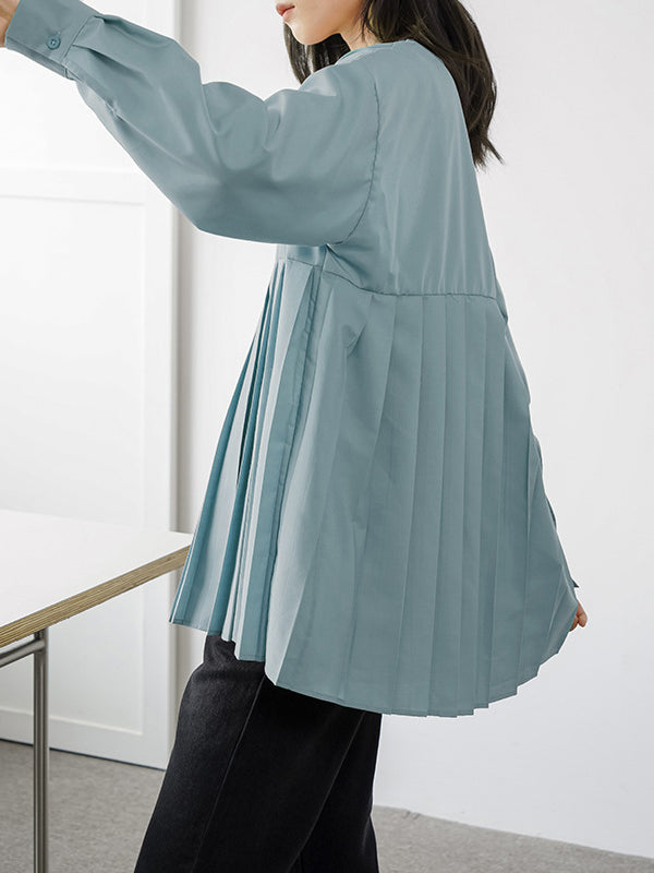 Long Sleeves Loose Buttoned Pleated Solid Color Round-Neck Blouses&Shirts Tops