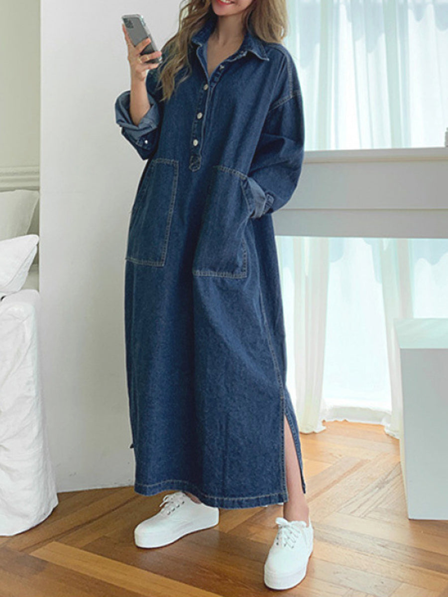 Long Sleeves Loose Buttoned Pockets Solid Color Split-Joint Split-Side Lapel Maxi Dresses Shirt Dress