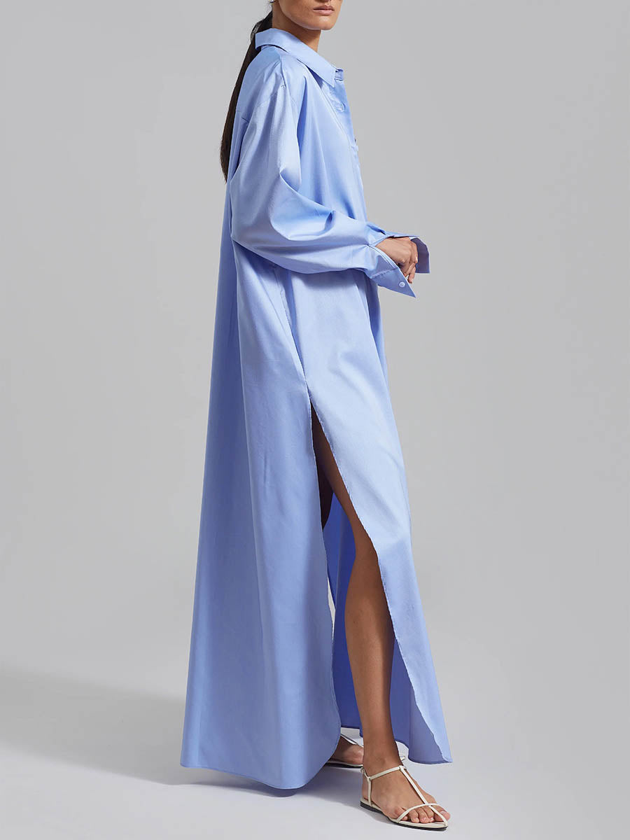 Long Sleeves Loose Buttoned Pockets Solid Color Split-Joint Split-Side Lapel Maxi Dresses Shirt Dress