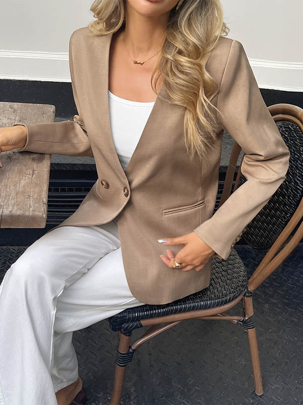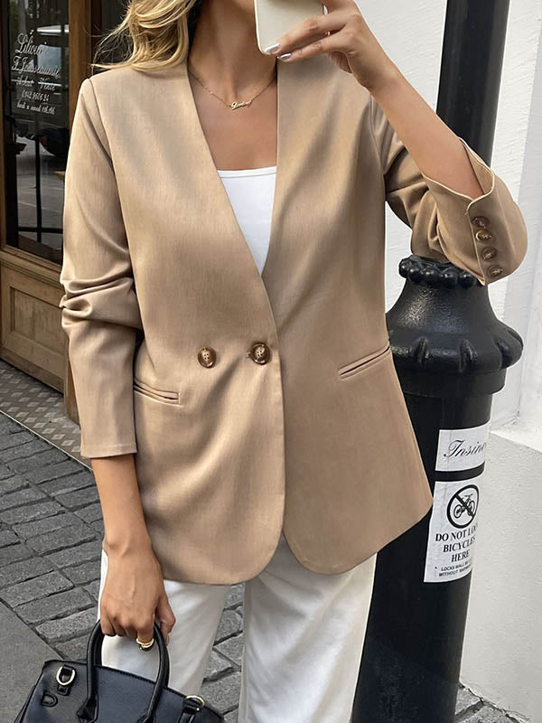 Long Sleeves Loose Buttoned Solid Color Split-Joint Collarless Blazer Outerwear