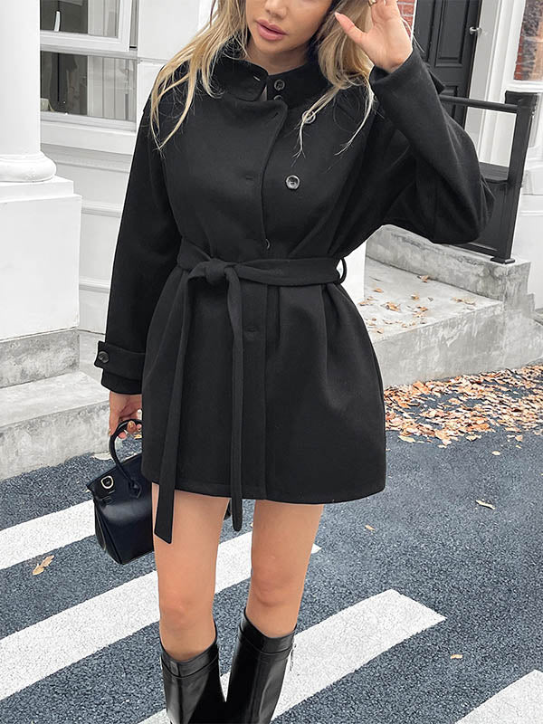 Long Sleeves Loose Buttoned Solid Color Split-Joint Tied Waist Stand Collar Coats Outerwear