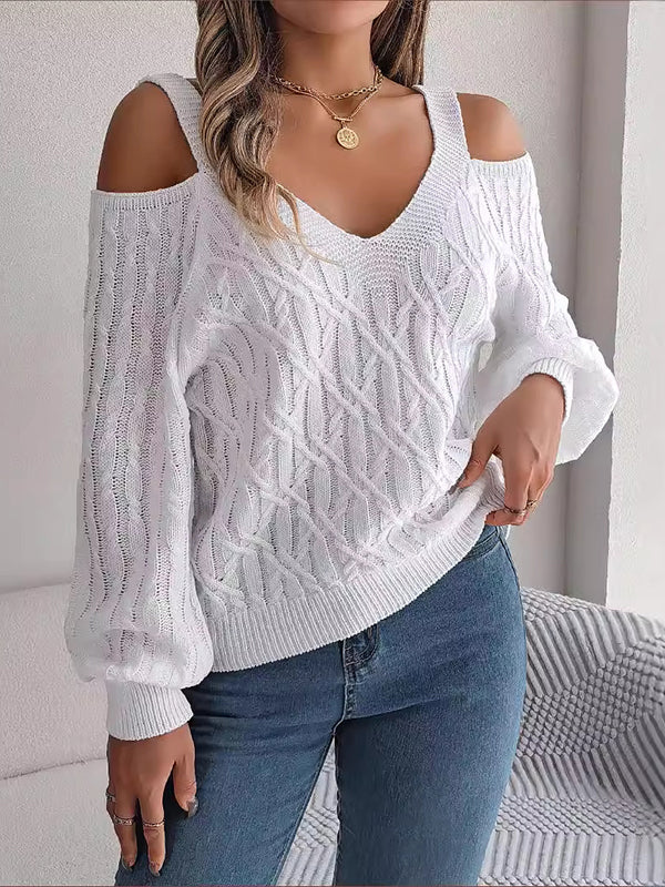 Long Sleeves Loose Cable Knit Solid Color Cold Shoulder Sweater Tops