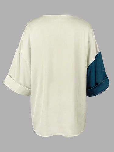 Long Sleeves Loose Color-Block Contrast Color Drawstring Elasticity V-Neck Blouses&Shirts Tops