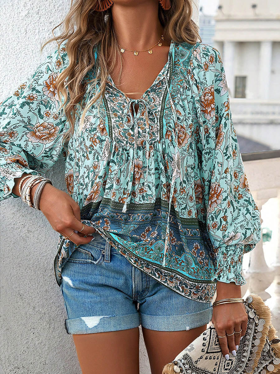 Long Sleeves Loose Contrast Color Drawstring Flower Print Pleated Split-Joint V-Neck Blouses&Shirts Tops
