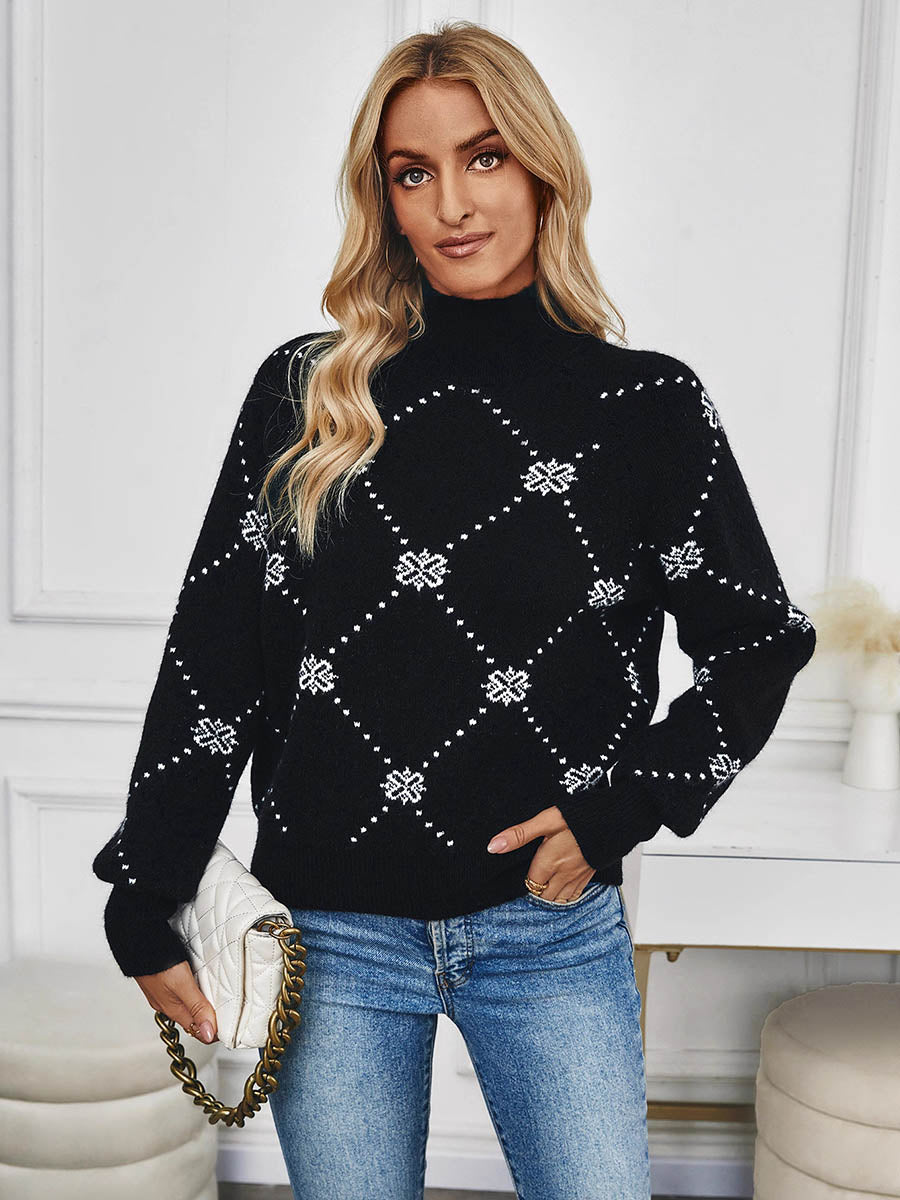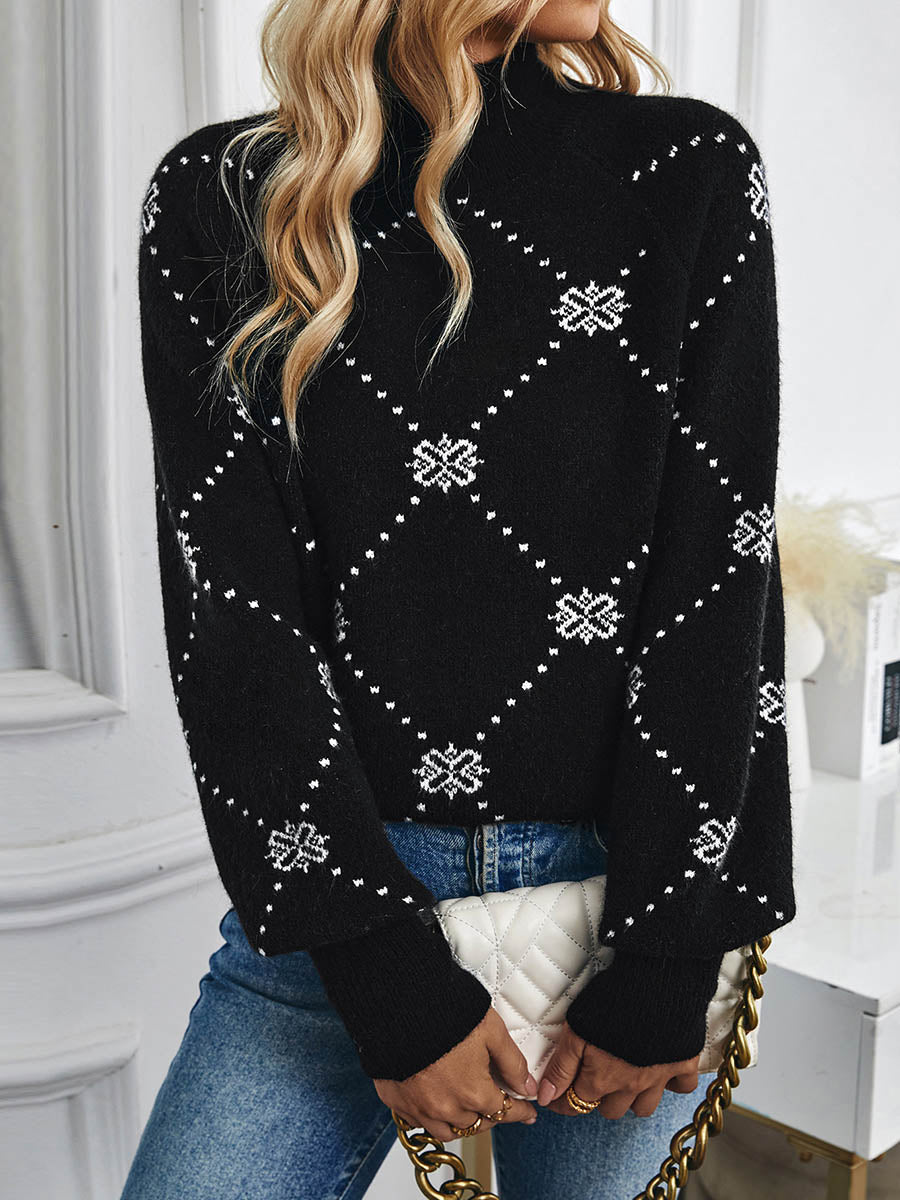 Long Sleeves Loose Contrast Color Flower Print Geometric Split-Joint Half Turtleneck Sweater Tops
