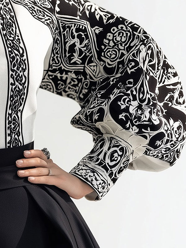 Long Sleeves Loose Contrast Color Flower Print High Neck Blouses&Shirts Tops