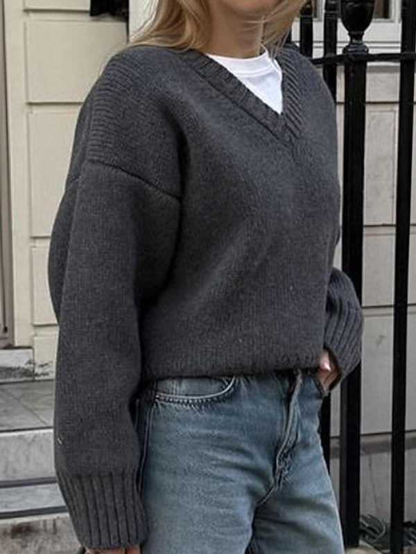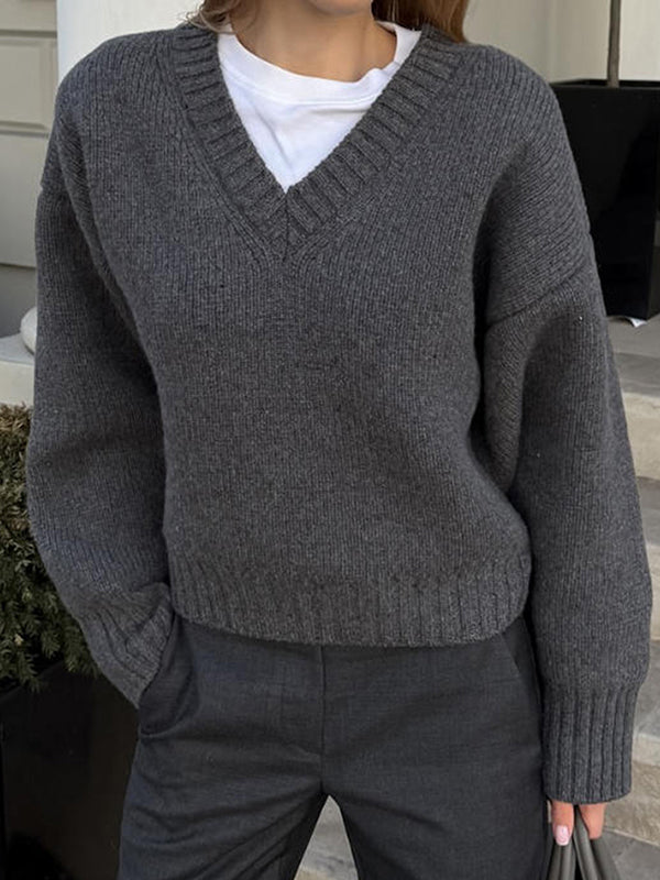 Long Sleeves Loose Ribs Solid Color V-Neck Sweater Tops