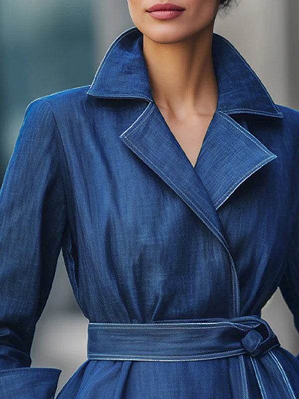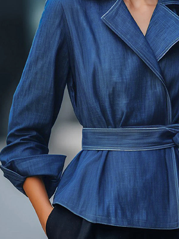 Long Sleeves Loose Solid Color Tied Waist Notched Collar Outerwear