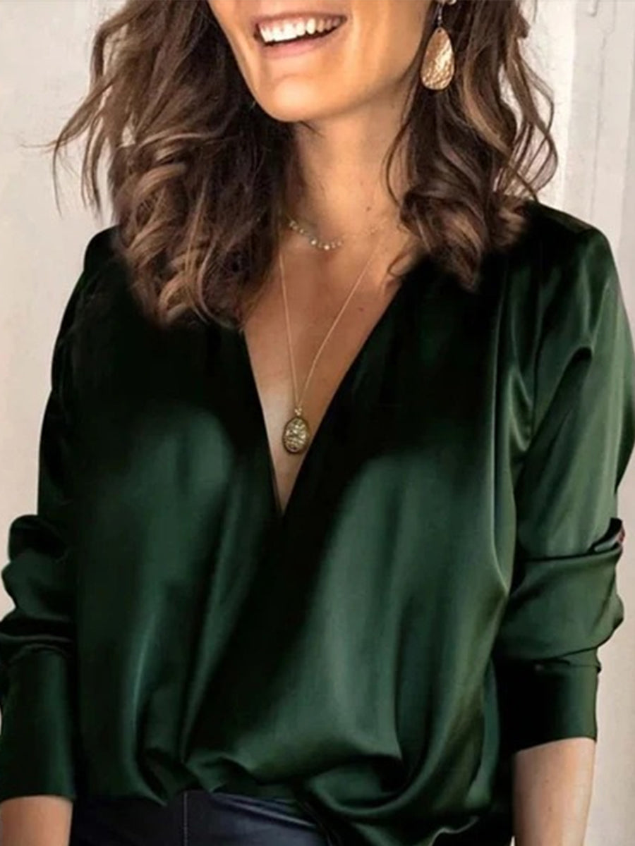 Long Sleeves Plus Size Loose Solid Color V-Neck Blouses&Shirts Tops
