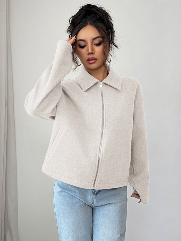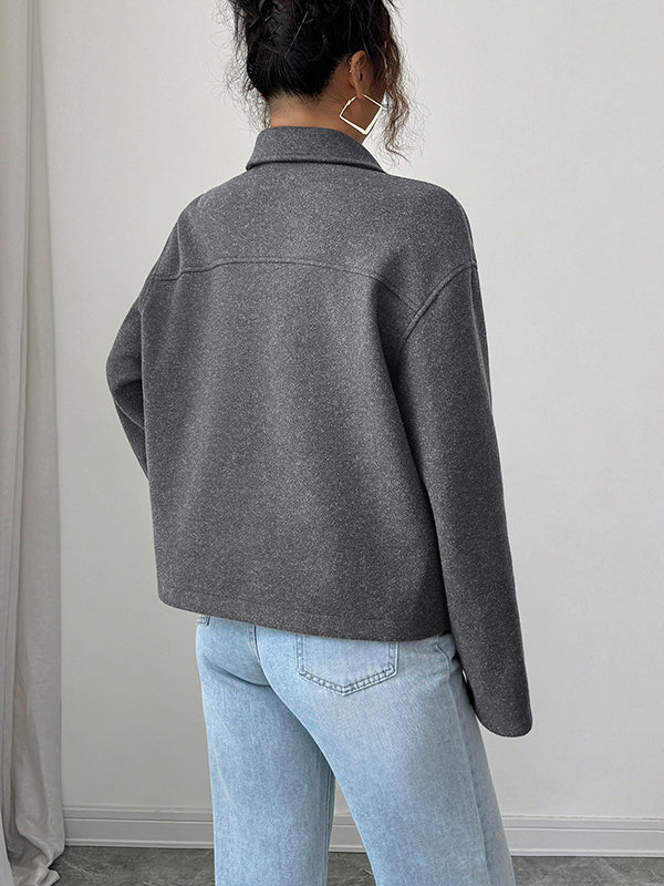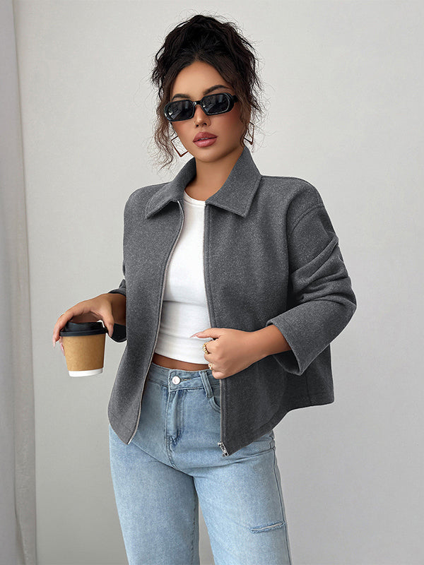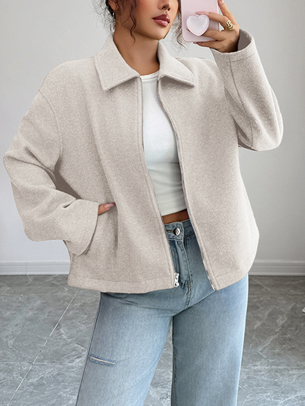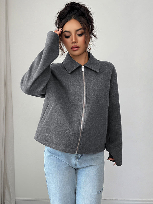 Long Sleeves Loose Solid Color Zipper Lapel Outerwear