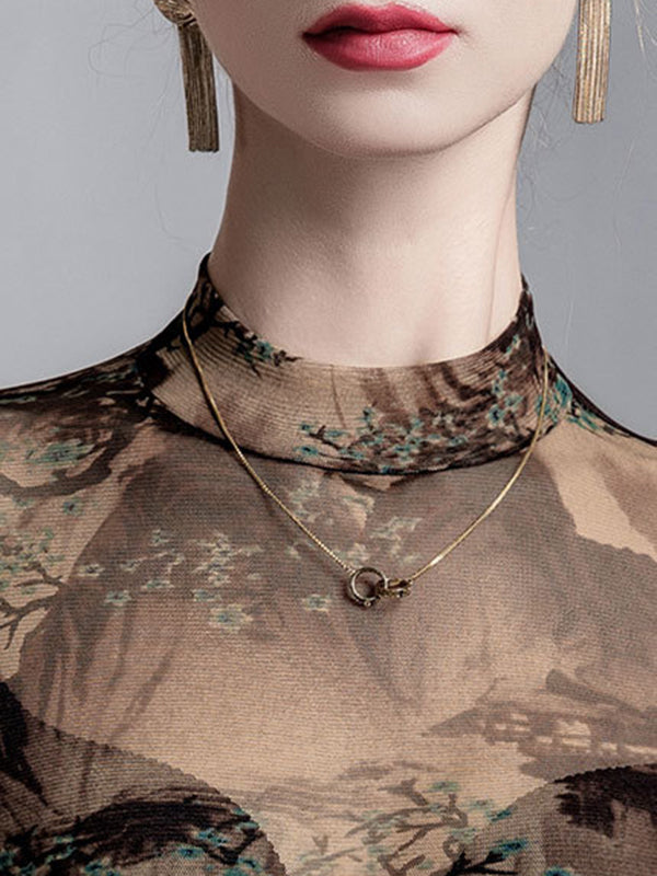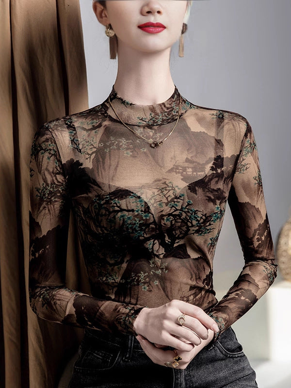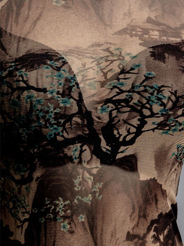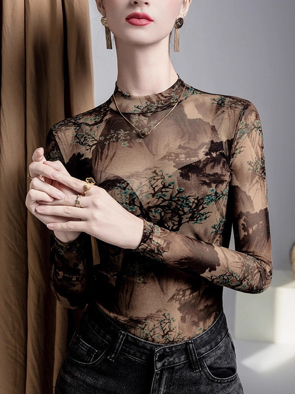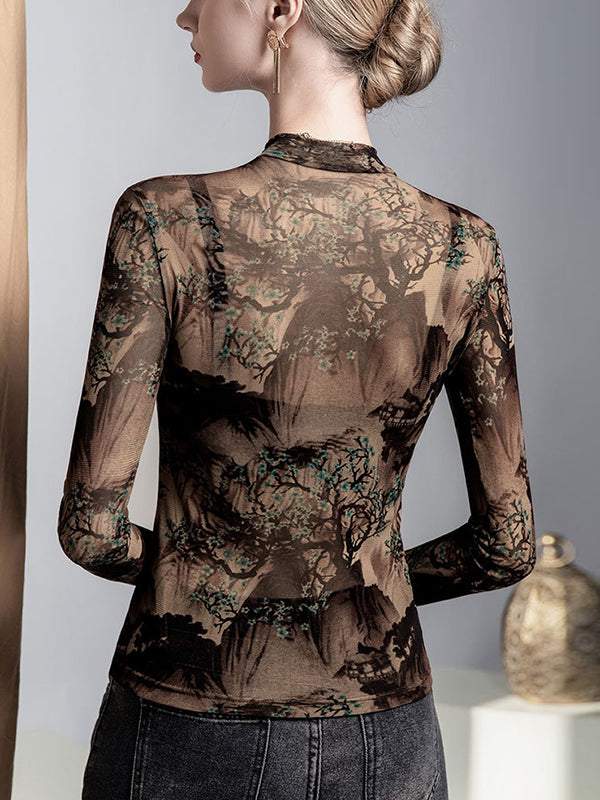 Long Sleeves Plus Size Asymmetric Mesh See-Through Split-Joint Round-Neck T-Shirts Tops
