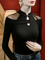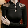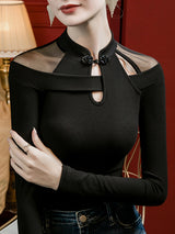 Long Sleeves Plus Size Hollow Solid Color Split-Joint Mock Neck T-Shirts Tops