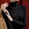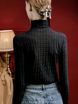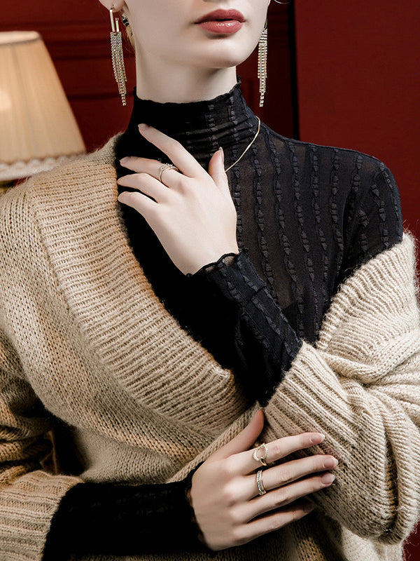 Long Sleeves Plus Size Jacquard See-Through Solid Color Split-Joint High Neck T-Shirts Tops