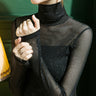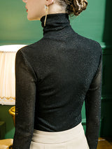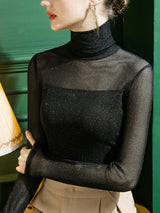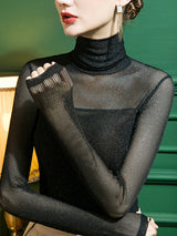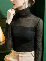 Long Sleeves Plus Size See-Through Sequined Solid Color Split-Joint High Neck T-Shirts Tops