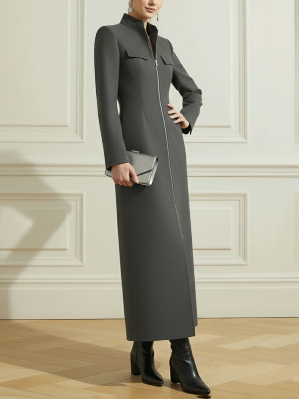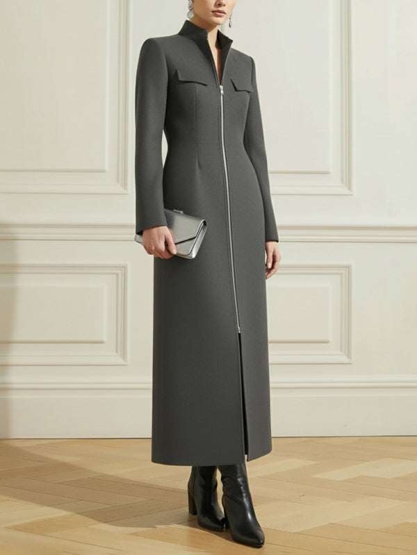 Long Sleeves Pockets Solid Color Split-Joint Zipper Stand Collar Outerwear