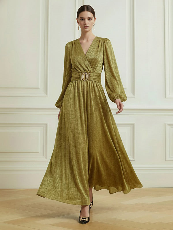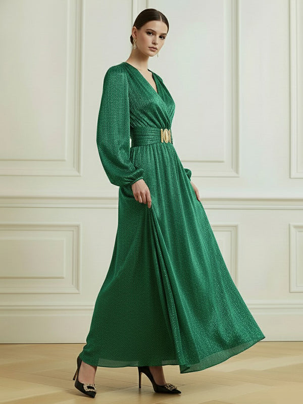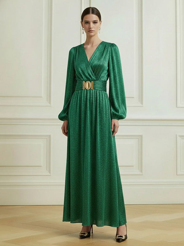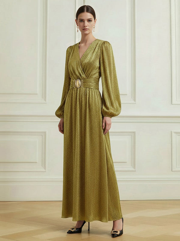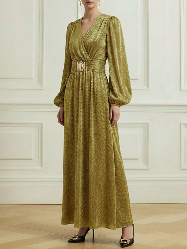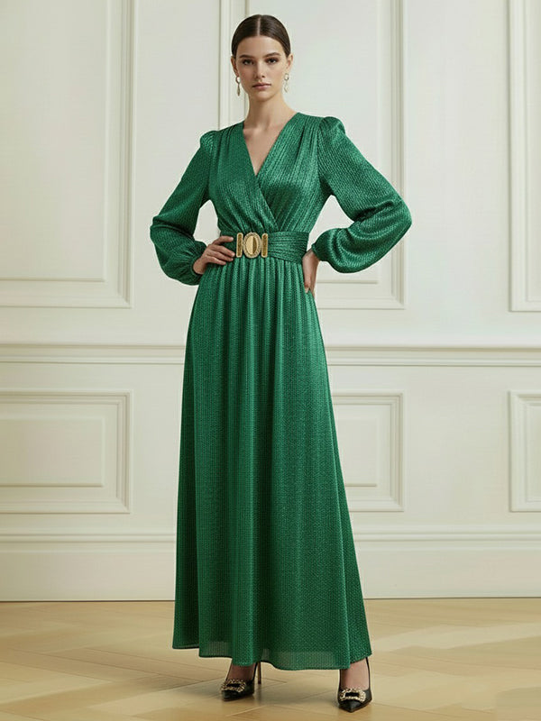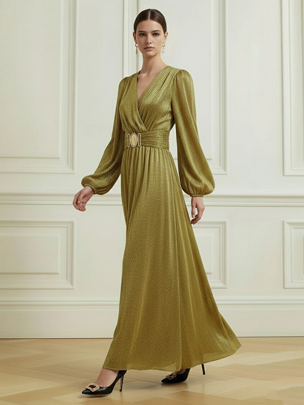 Long Sleeves Puff Sleeves Belted Elasticity Pleated Solid Color Zipper Deep V-Neck Maxi Dresses