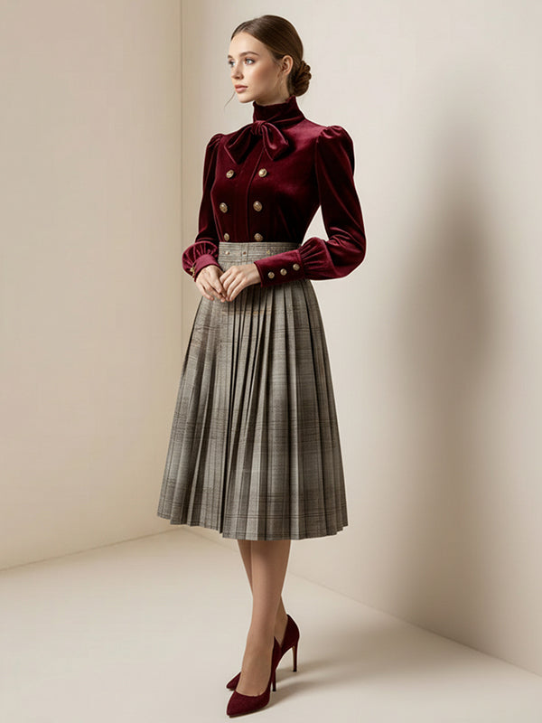Long Sleeves Puff Sleeves Bow-Embellished Buttoned Contrast Color Pleated Split-Joint High Neck Blouses&Shirts Tops