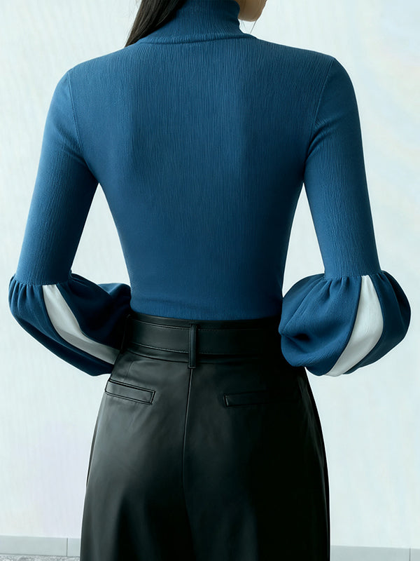 Long Sleeves Puff Sleeves Contrast Color High Neck Pullovers