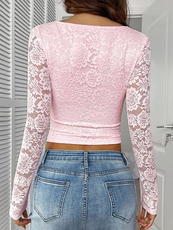 Long Sleeves Skinny Bow-Embellished Flower Print Hollow See-Through Split-Joint Deep V-Neck Blouses&Shirts Tops