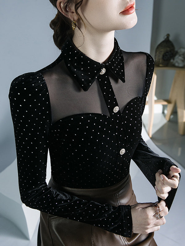 Long Sleeves Skinny Buttoned Polka Dot Split-Joint Lapel T-Shirts Tops